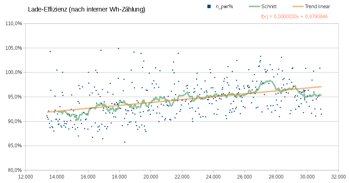 Da ich lange die EKM-Daten nicht einzeln notiert habe, habe ich die interne Wh-Zählung des OVMS nochmal für die gleiche Auswertung verwendet (RT-PWR-Log Spalte power_recd_wh, nur hinreichend lange Ladevorgänge). Die Zählung ist nicht so exakt wie das EKM, aber reicht für den Trend.