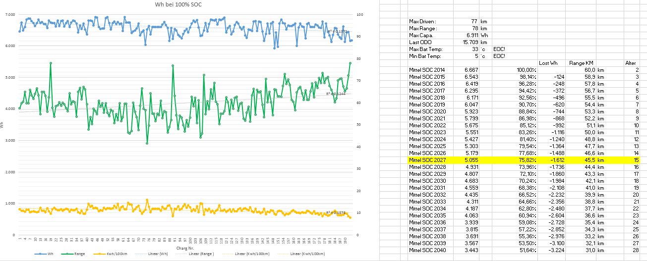 Also: 2% pro Jahr oder 10.000 km sind vermutlich ein guter Richtwert, und Franks Daten deuten auf einen leicht höheren Einfluss der kalendarischen Alterung hin.