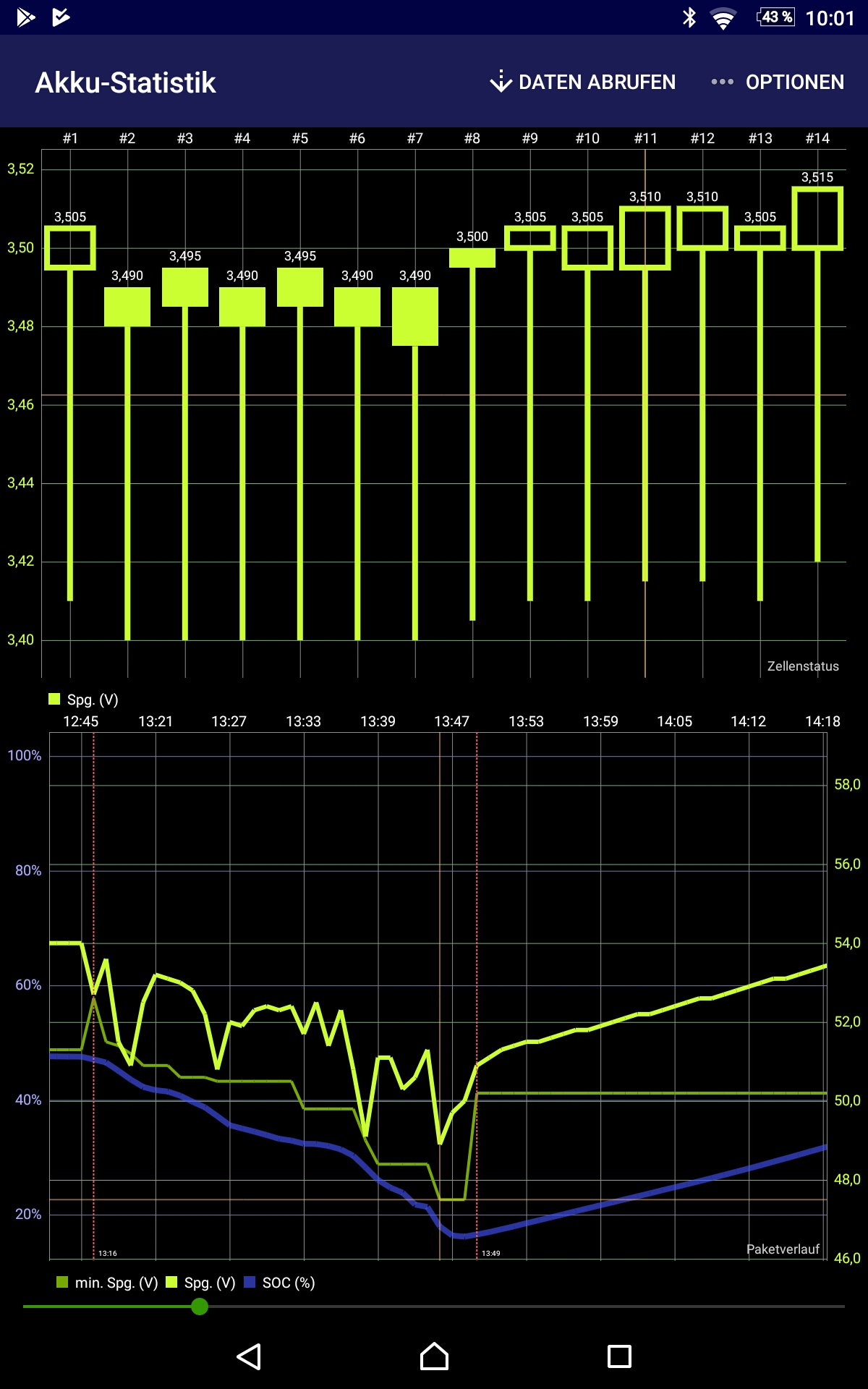 Bei unter 20% SOC den Berg rauf sahen die Zellenspannungen so aus: