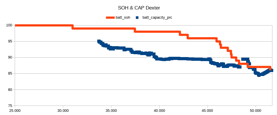 Mit dexters Formel oben liege ich in etwa auf dem erwarteten Wert: SOH (<< 103,7% - Laufleistung[1000km] * 0,26) = 103,7% - 52 * 0,26 = 90,18