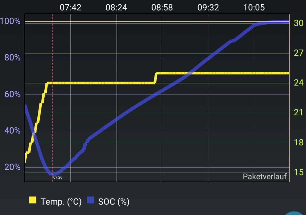 Die gelbe Kurve ist die Temperatur, 25km Autobahn bringen 7 Grad, während das Aufladen nur 1..2 Grad bringt. Wenigstens kühlt der Akku nicht aus!