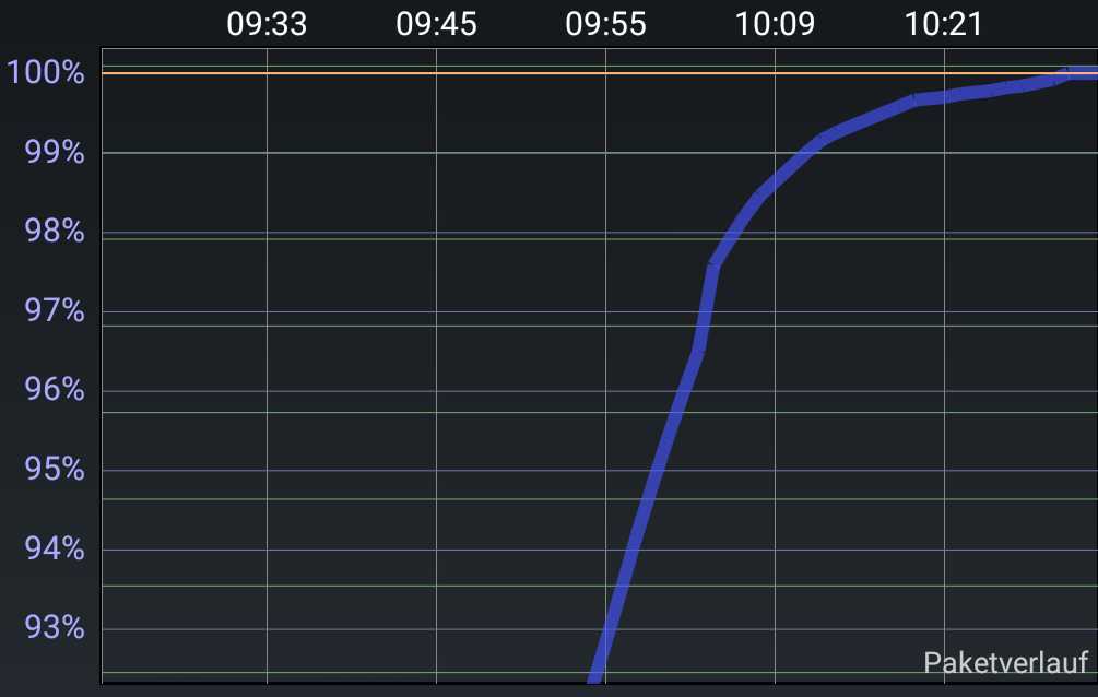 Wenn der Akku fast voll ist, reduziert der Lader die Leistung, deshalb auch die Empfehlung, bei 97% abzubrechen. Den Knick in der Ladekurve sieht man deutlich bei 97,5%. Die Restladung von knapp 3% dauert dann noch 30 Minuten.