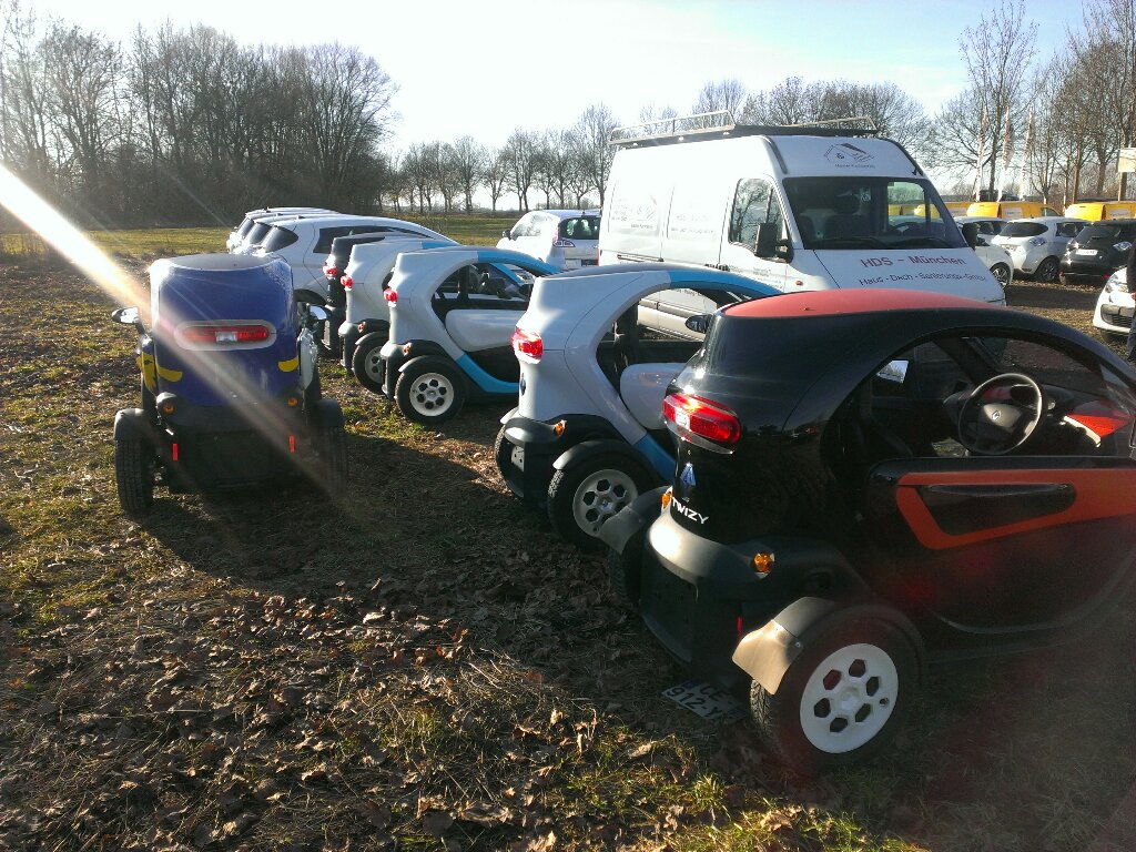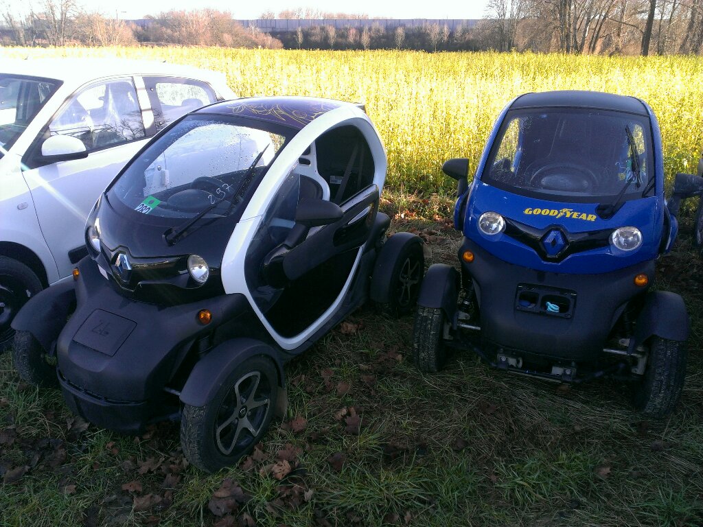 Hier ein paar Fotos vom Twizy-Land. Ein Haufen Frankreich-Import Twizy's. U.a. von einer Reifennmarke ...