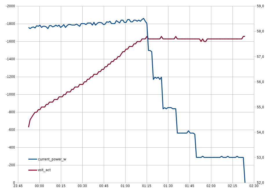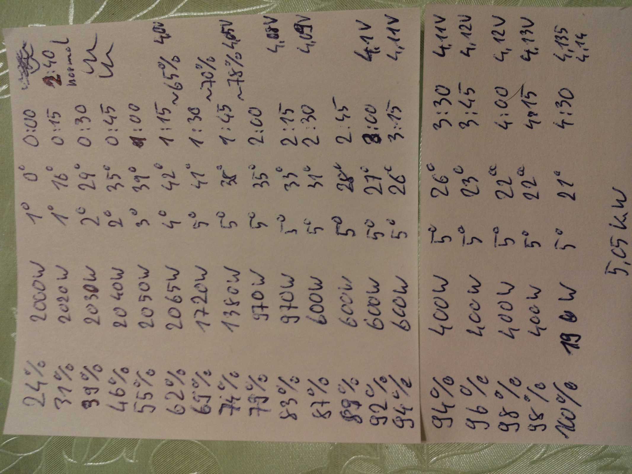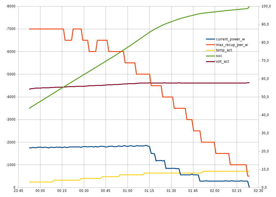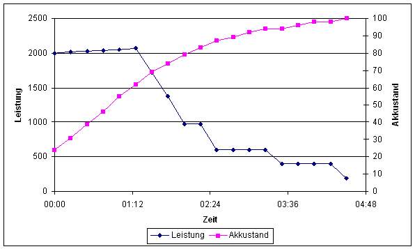 In den ersten Minuten steigt Strom/Leistung noch etwas an auf ca.2,2kW regelt dann runter auf 1,6kW -> 1,3kW -> 0,9kW -> 0,55kW -> 0,35kW. Angefangen hatte ich mit einem Rest von 11%