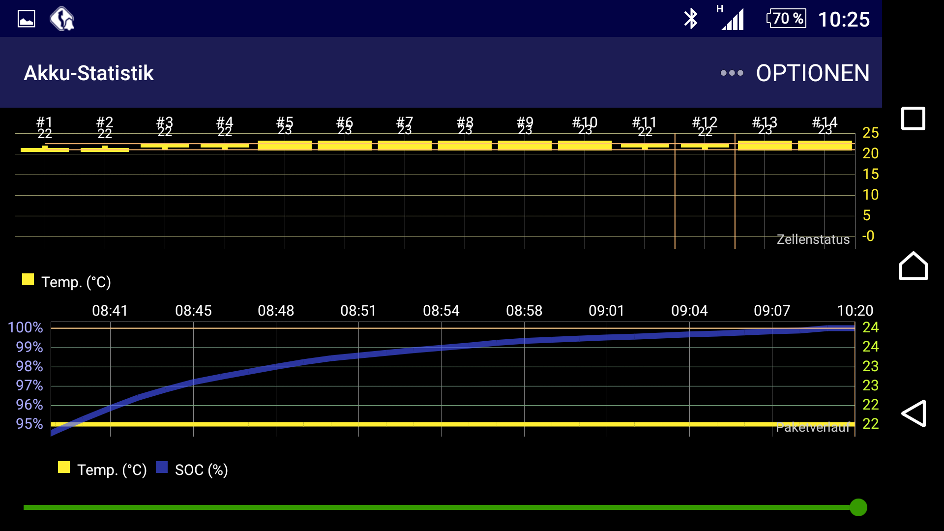 Akkutemperatur übrigens 4° zu Beginn (bin 2 Tage nicht gefahren, daher war der Akku ausgekühlt) und 9° am Ladeende.