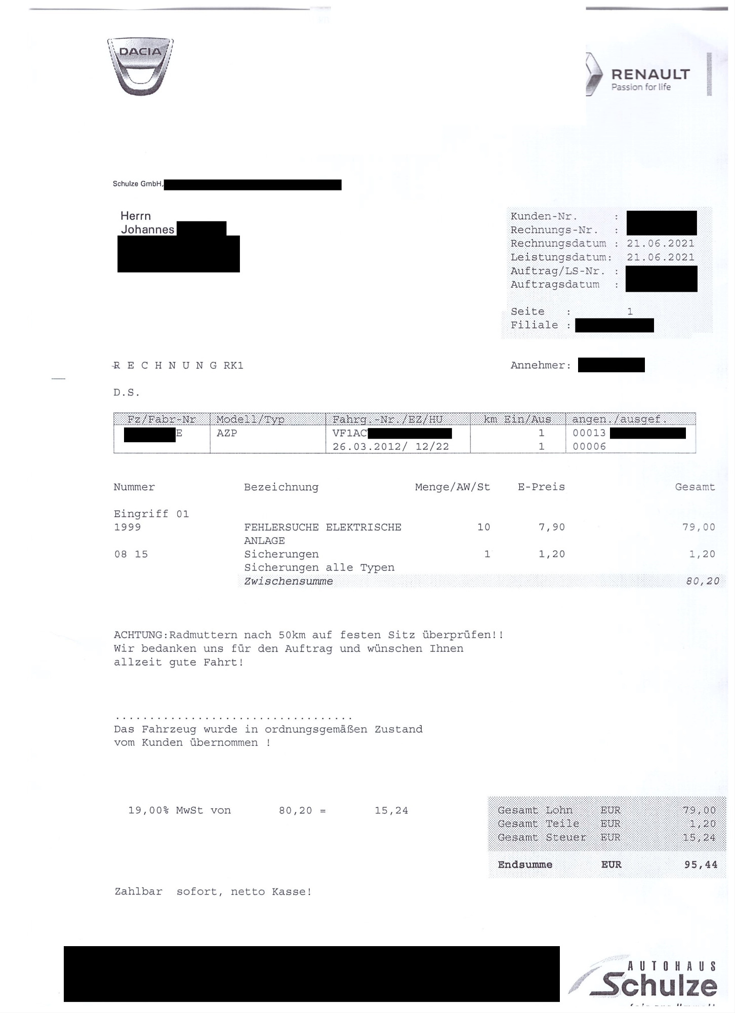 Aber der Hammer war die Rechnung dazu. Über 95€ für eine 10ct. Sicherung. Einen Rabatt o.ä. gab es auch nicht, obwohl alles am (Vermutlich Verursacher) Hochvoltstrang neu (mit Garantie) ist.