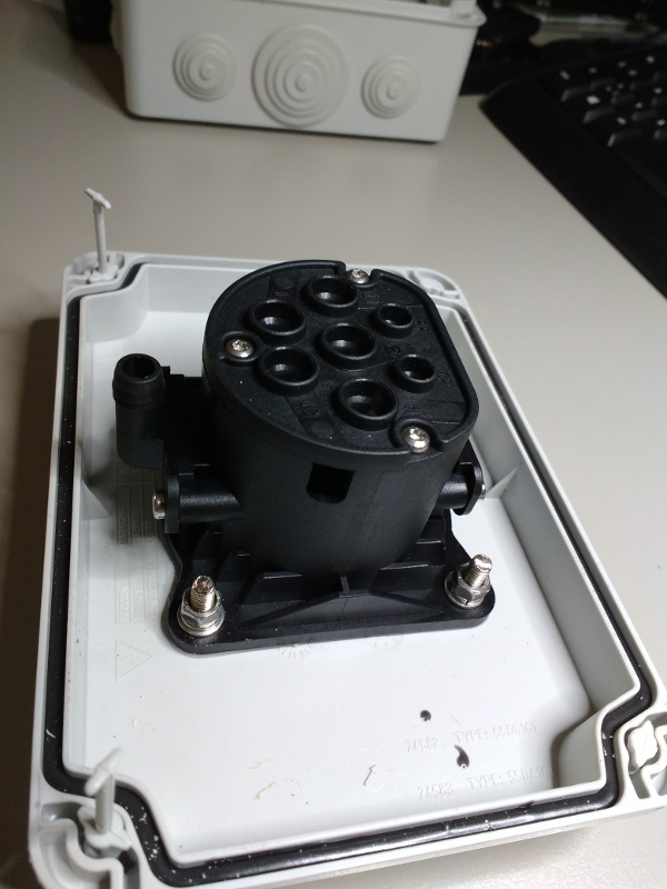 Die Dose hat Schraubklemmen und ist ohne Aktor/Verriegelungseinheit. Frontdeckel macht einen soliden Eindruck, ist mit 4x M5 Stehbolzen mit der eigentlichen Dose verschraubt. Beigelegt waren 2 Silikon-Flachdichtungen in passender Lochung.