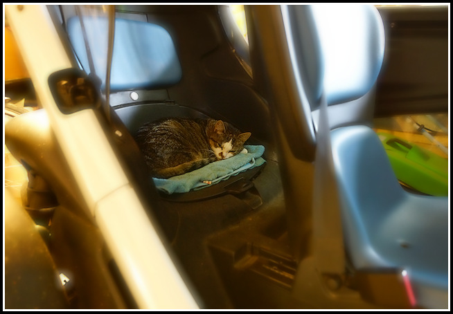 Mein Kater nimmt auch gerne den Twizy in Beschlag, er steht mit offener Tür in der Garage.