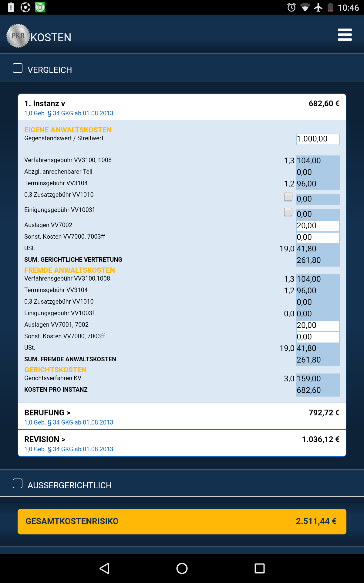 franktastic schrieb: Hier Mal die Kosten eines Rechtsstreits in der ersten Instanz (sog. Prozeßkostenrisko) bei 1000,00 €, also grundsätzlich überschaubar wenn man es selber zahlen muss. Allerdings könnten noch Gerichtsgutachterkosten dazu kommen.