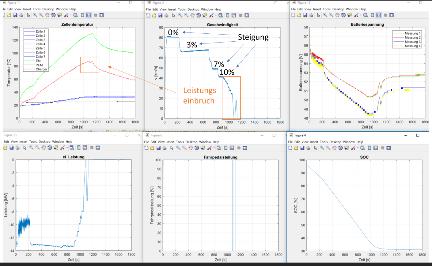 In einer ersten Messung haben wir solange Vollgas gegeben ohne jegliche Kühlung, bis einer der Komponenten in die Knie ging. Da bekanntlich bei 80 km/h nicht die maximale Leistung gezogen wird, haben wir sukzessive die Steigung erhöht durch Anpassung der Parameter am Prüfstand.
