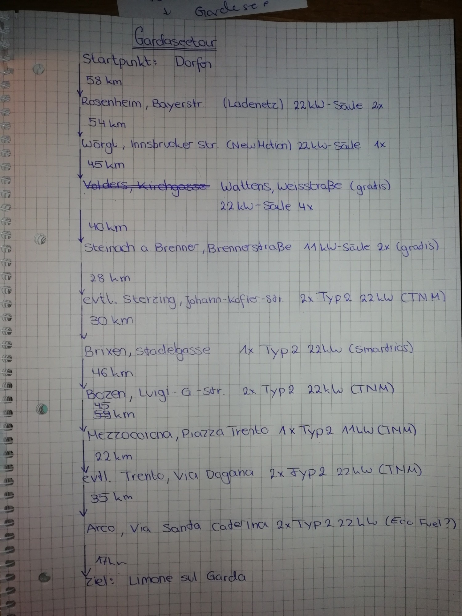Das wäre meine Hin-/Rückreisevorschlag samt möglichen Ladesäulen die man ansteuern könnte.