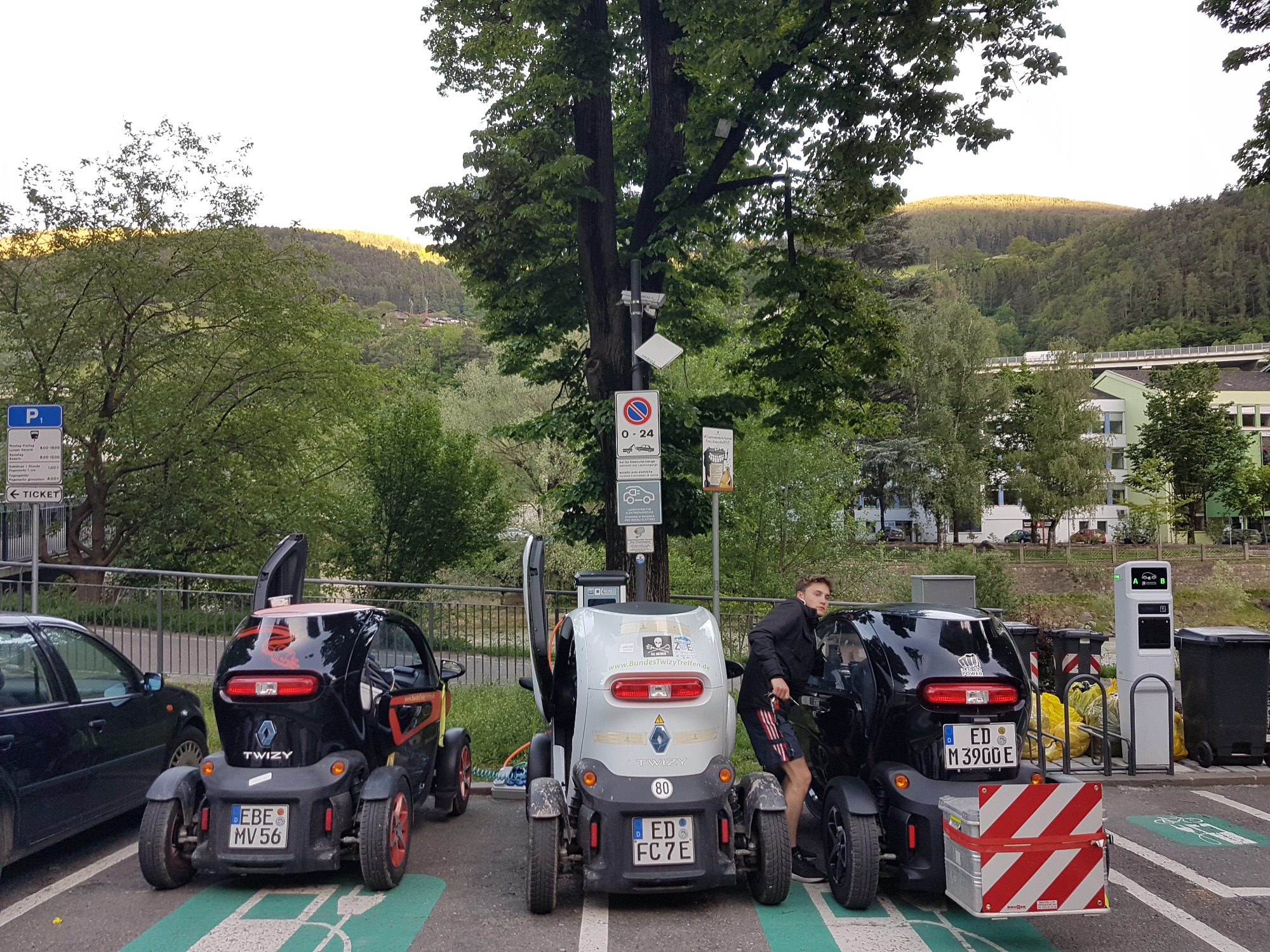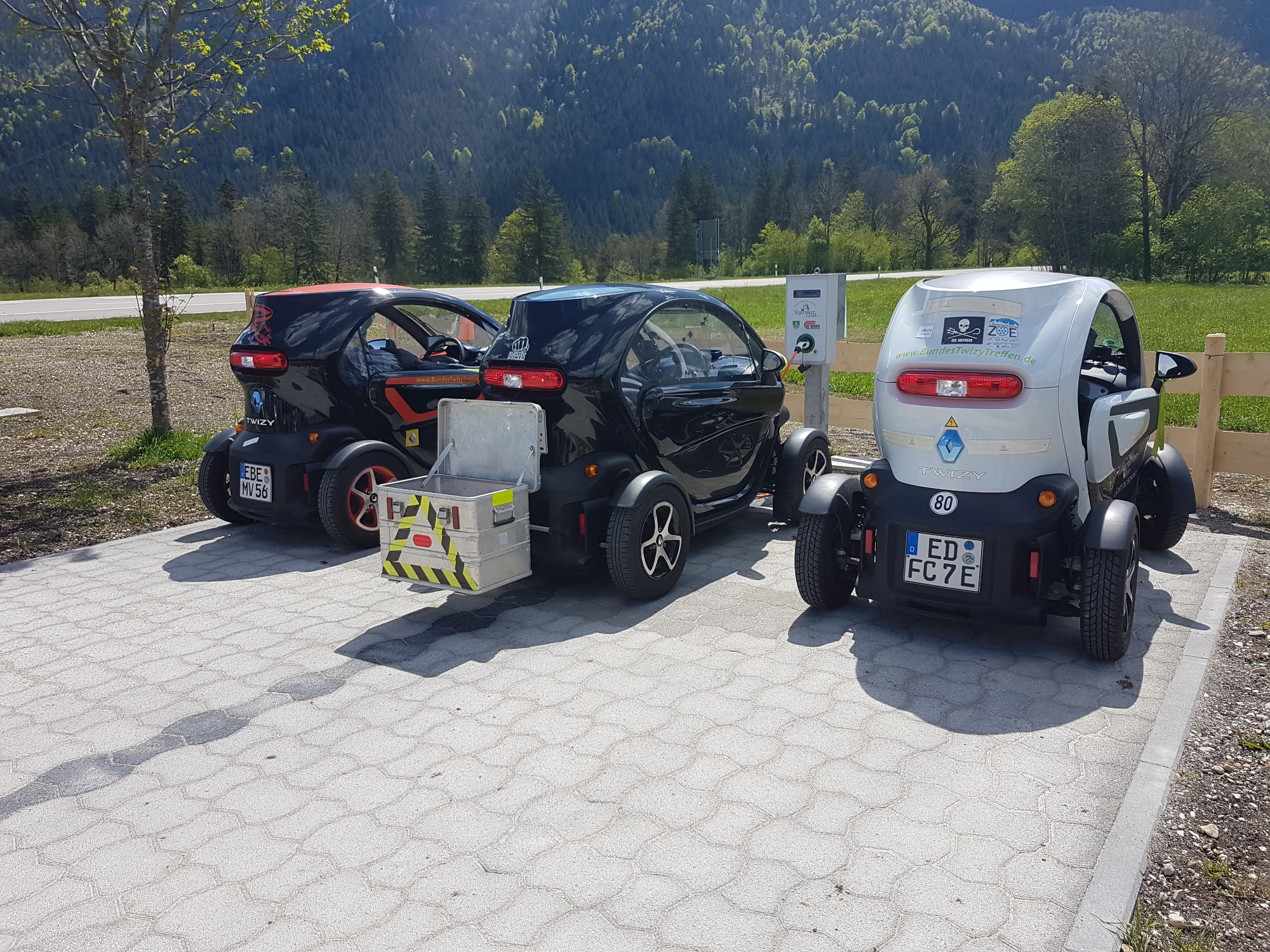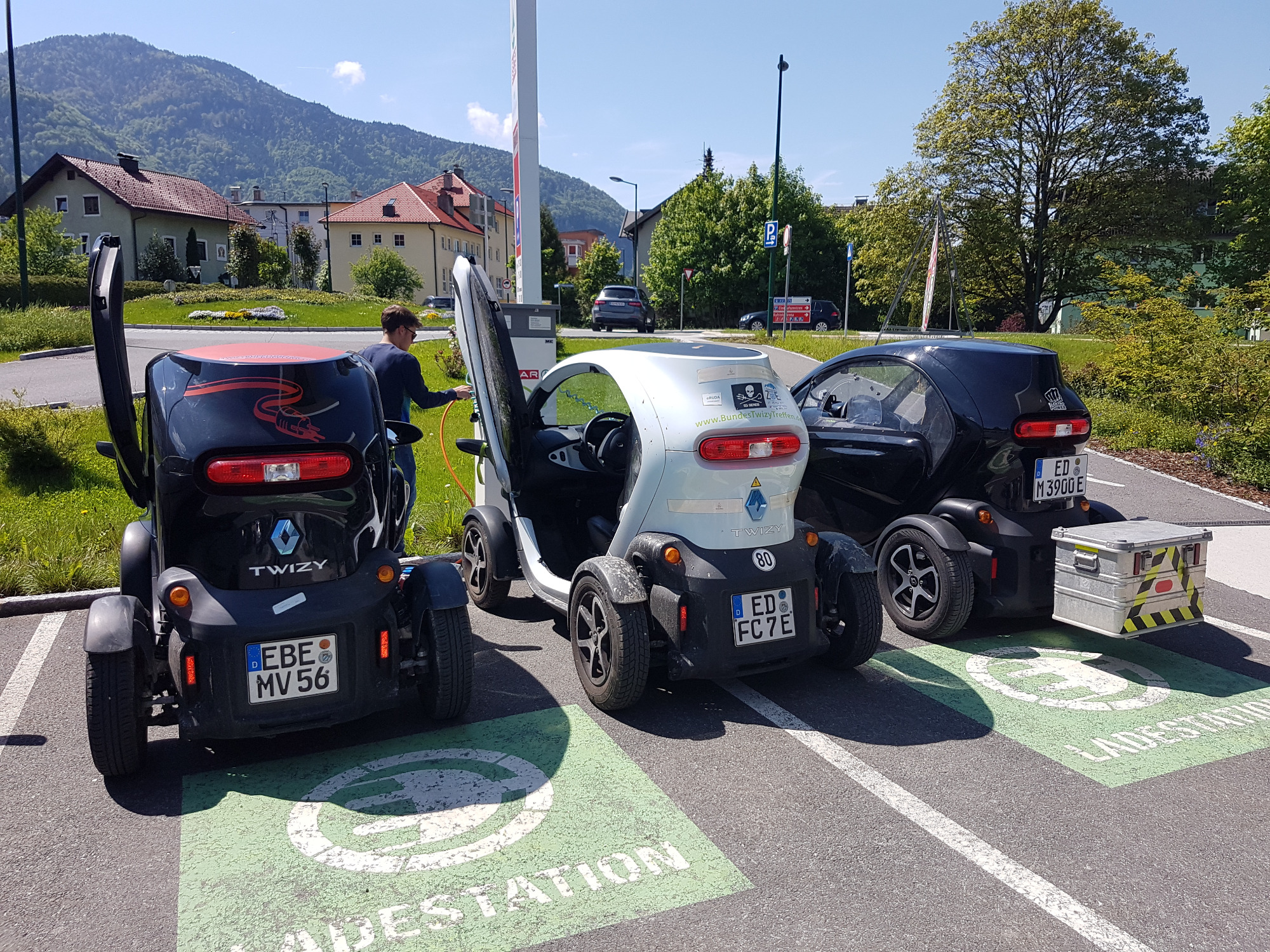 E-Bikestationen können zuverlässig maximal einen Twizy laden, bei mehr als einem fliegt die Sicherung (samt Touristinfo oder Waschanlage