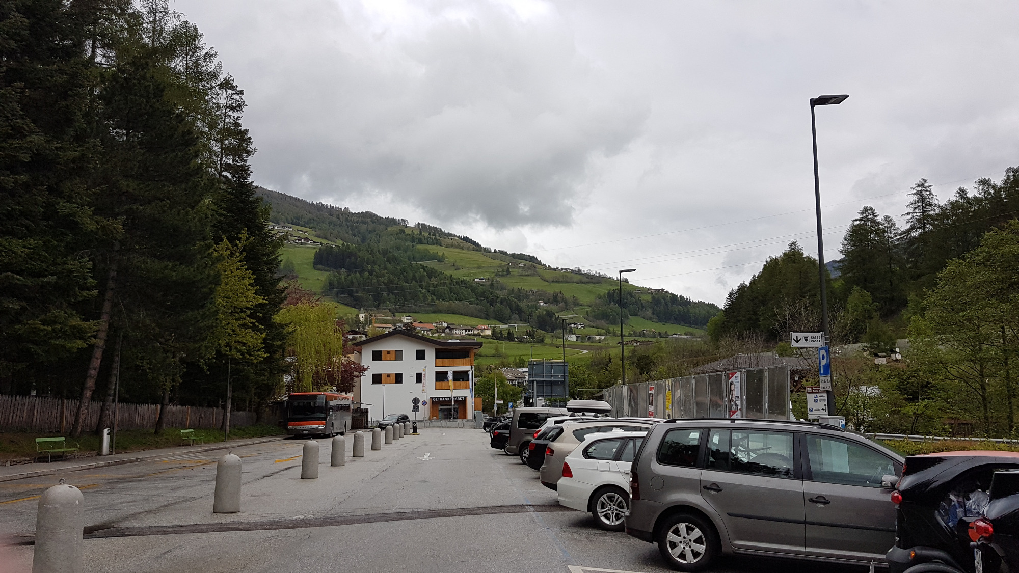 Ziemlich genau Mittags erreichten wir im starken Regen die Brennerpasshöhe (Outletcenter, Garagen und Bahnhofsanlagen) um gleich weiter nach Sterzing zu fahren, wo die nächste Ladestelle auf uns gewartet hat.
