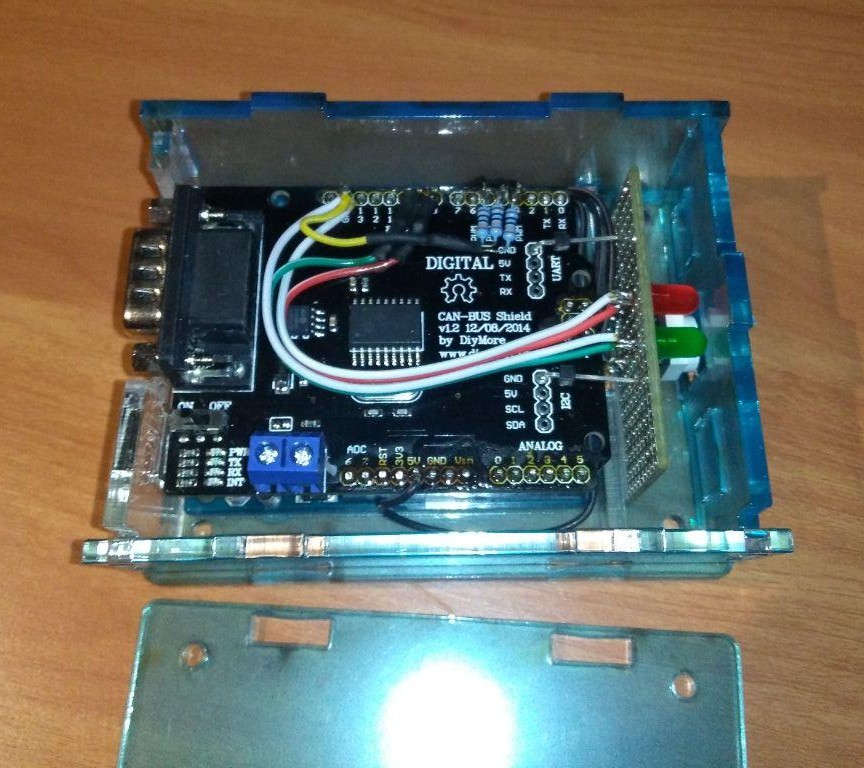 Dann ist das Gehäuse UNO Gehäuse zwar platzfreudig, aber dennoch hat man nicht weit genug gedacht, dass auch das CAN-Shield mit rein passen würde.
