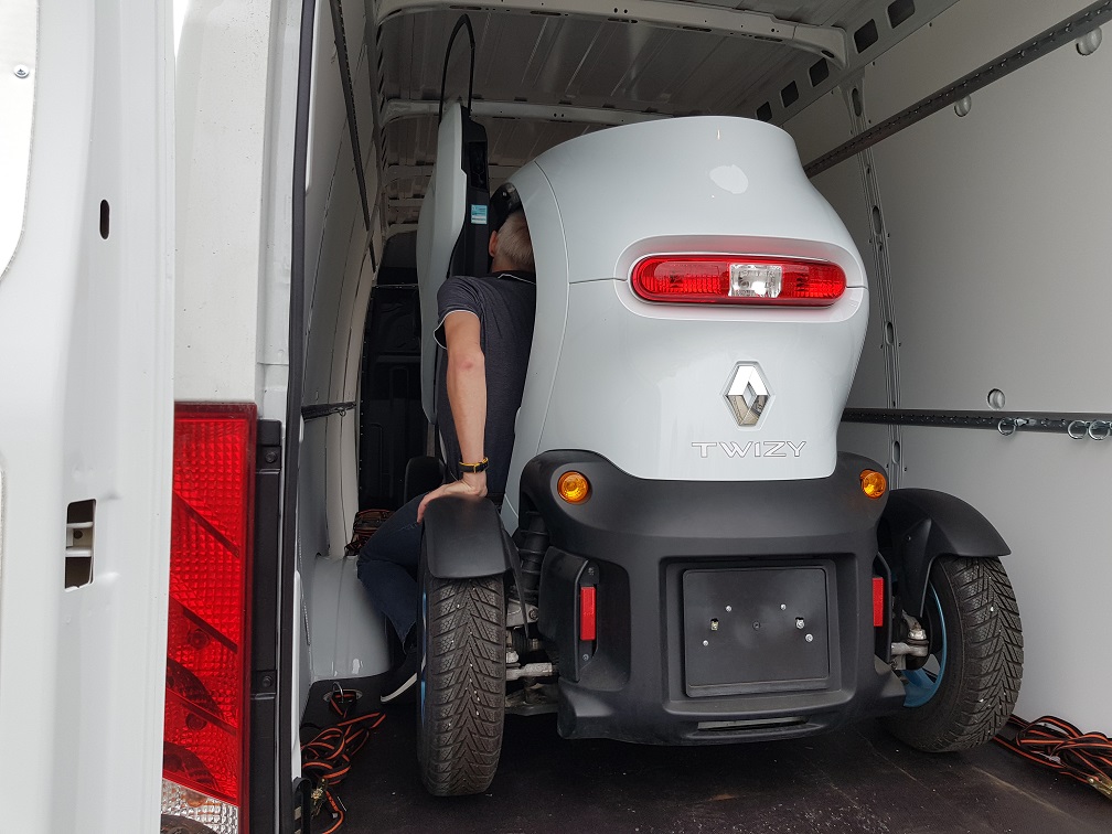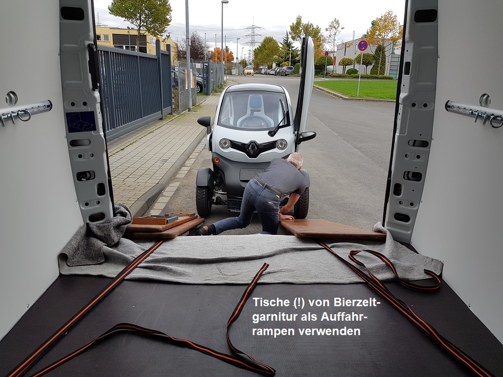 Ich hatte kürzlich den Twizy per Transporter (Europcar - VW Crafter gebucht, Iveco xx bekommen) abgeholt. Bierzeltgarnitur statt Auffahrrampen verwendet.