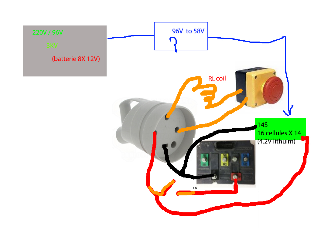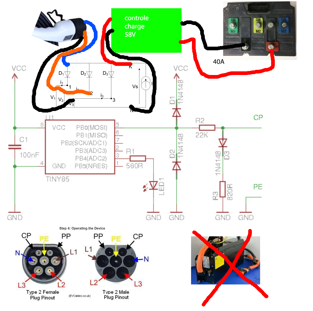 Glaubst du, es ist machbar, ein inoffizielles Ladegerät aus dem Twizy? Wir würden ein Ladegerät brauchen, das so einfach wie möglich ist, damit wir nicht mit 12 V, sondern nur mit 58 V arbeiten. Ich habe ein Diagramm erstellt, in dem wir die Steckdose Typ 2 zum Laden mit den öffentlichen Terminals und den 230 V für zu Hause verwenden würden. Was wäre der akzeptable Strom? 40A? oder weniger