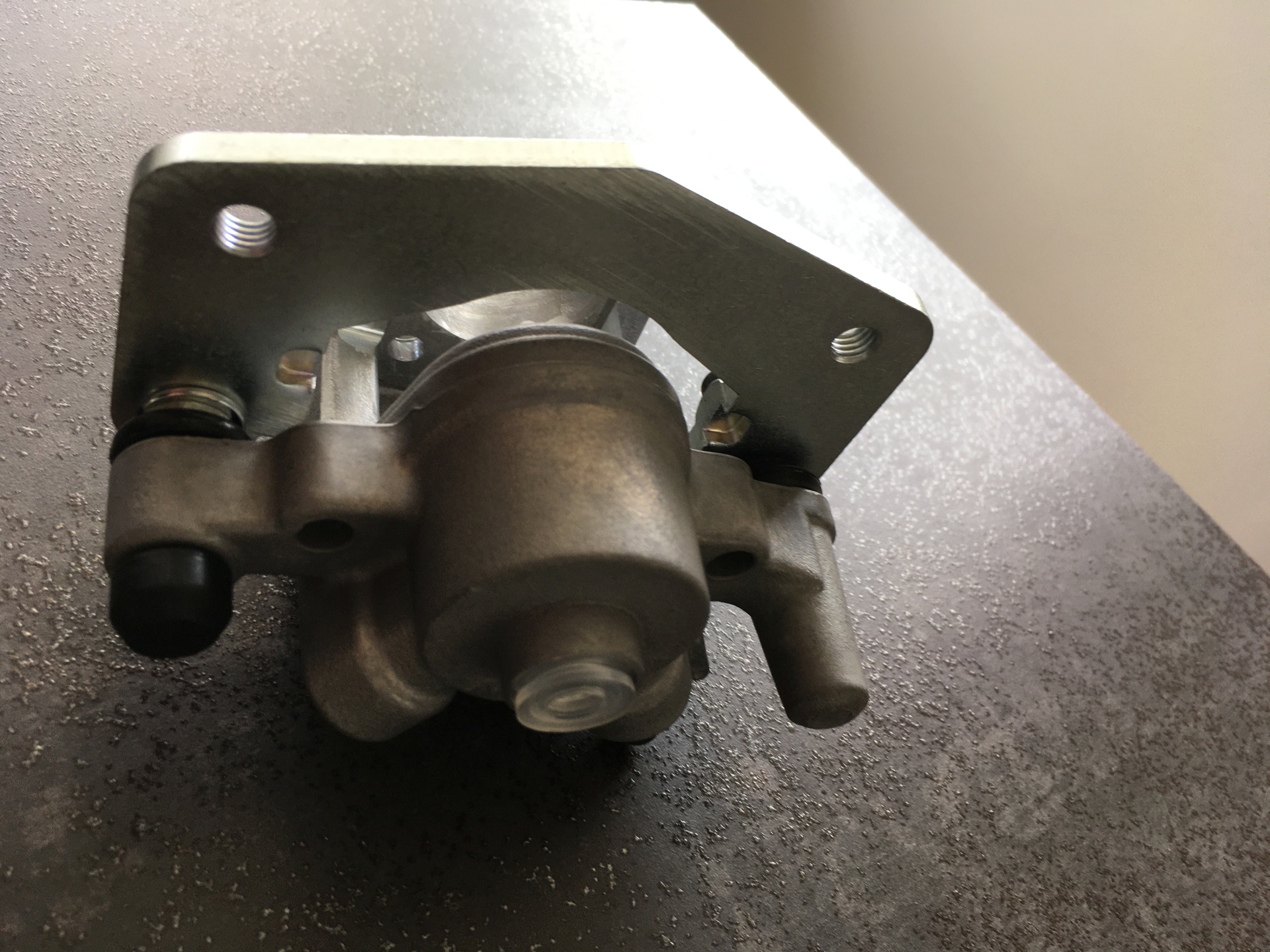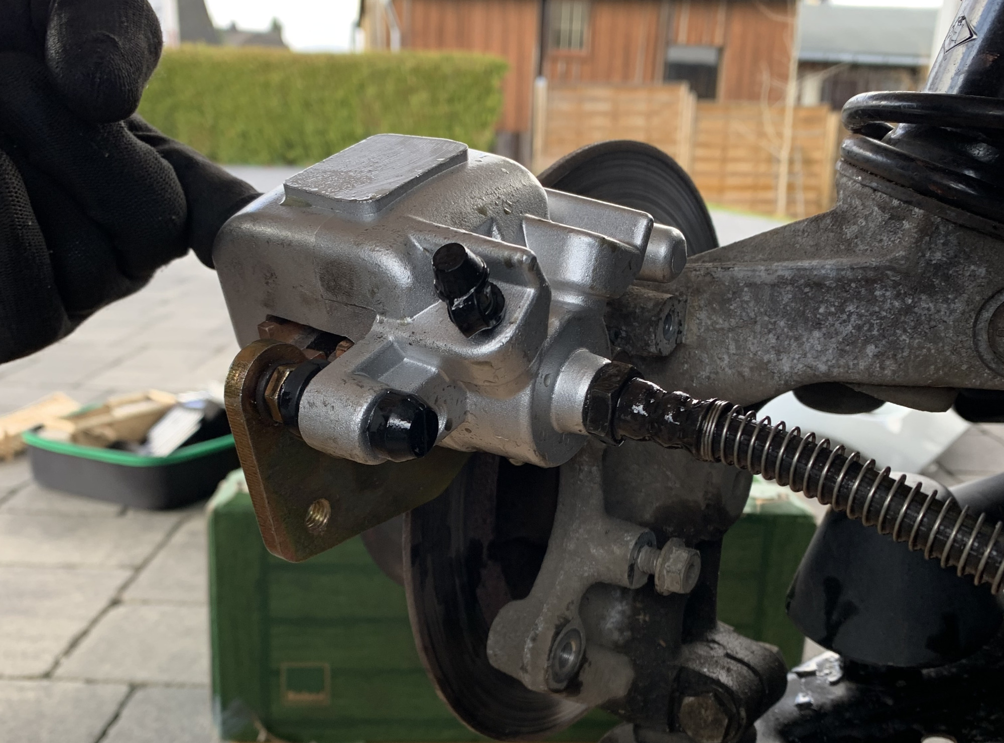 Zum entlüften habe ich einfach die obere Schraube des Halters leicht eingeschraubt und dann konnte ich den ganzen Sattel am Fahrzeug nach oben drehen.
