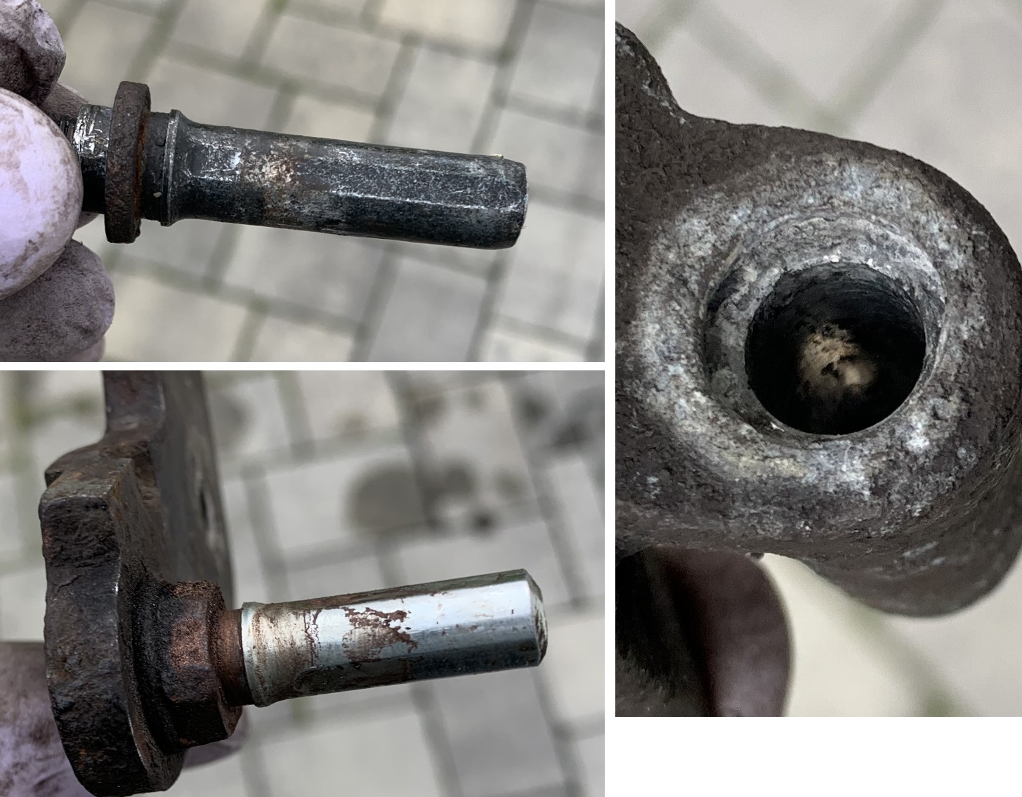 Der Sattel ist an verschiedenen Stellen ausgebrochen und zwischen den beiden Dichtungsringen ist ebenfalls Schmutz