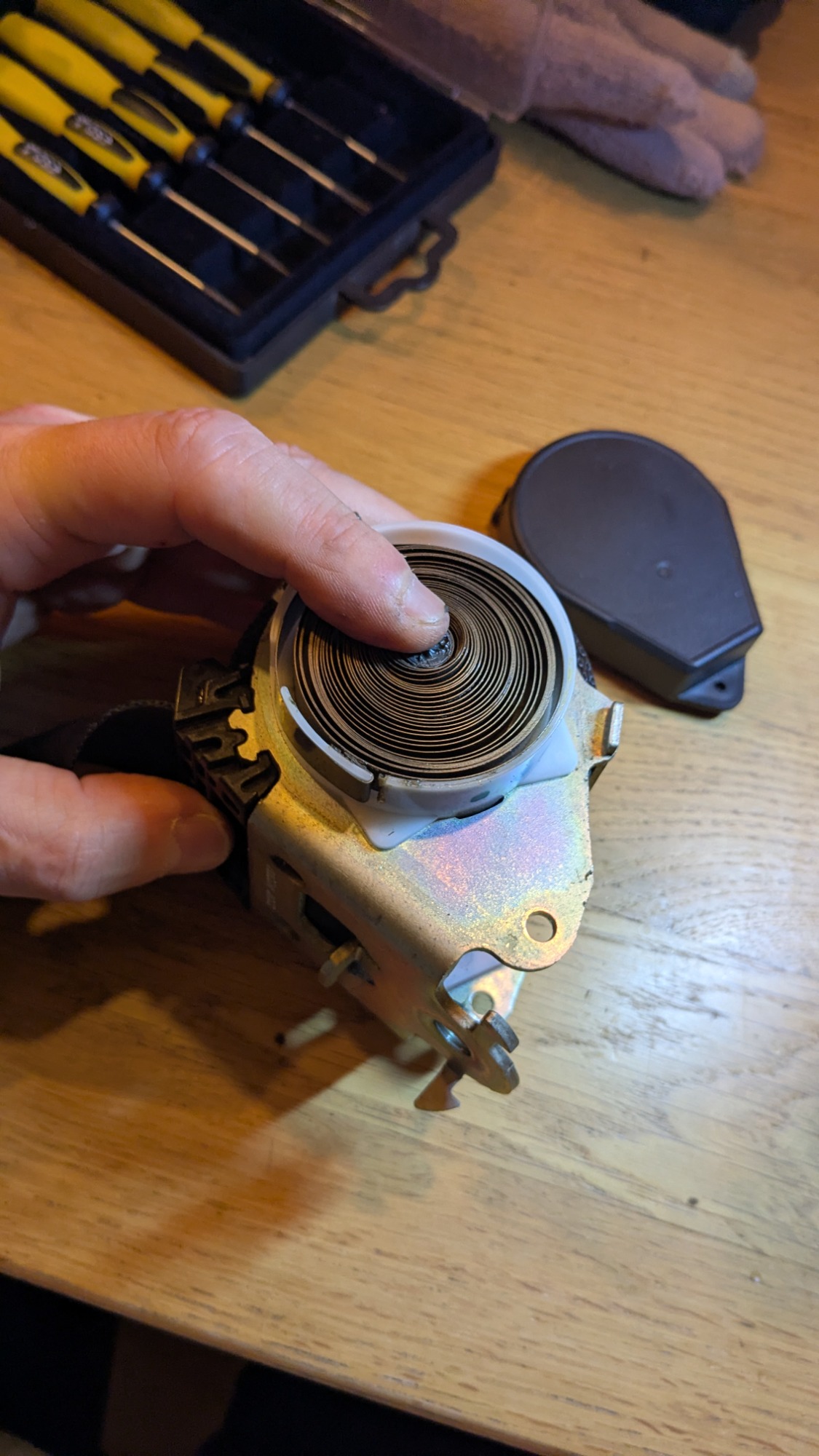 It's the first time I've seen a seat belt mechanism opened up, I don't fully understand how it works. This is a detailed view of the "caged ball bearing". It doesn't seem damaged or anything: