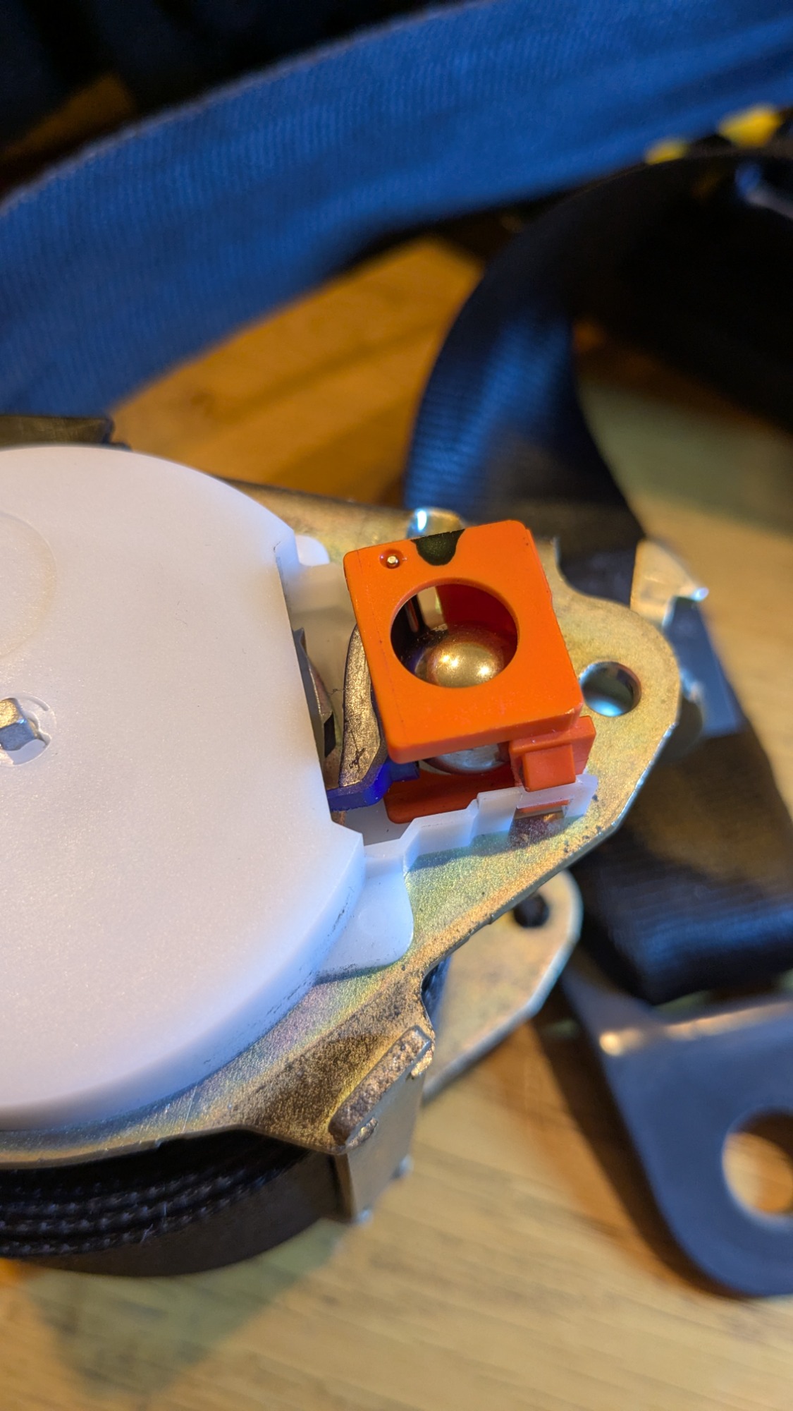 But now the weird part: with this subassembly removed, the seat belt unit seems to work perfectly. When I pull out the belt slowly, it comes out. When I yank it out, it blocks. This all of course with the roll-up unit oriented correctly.