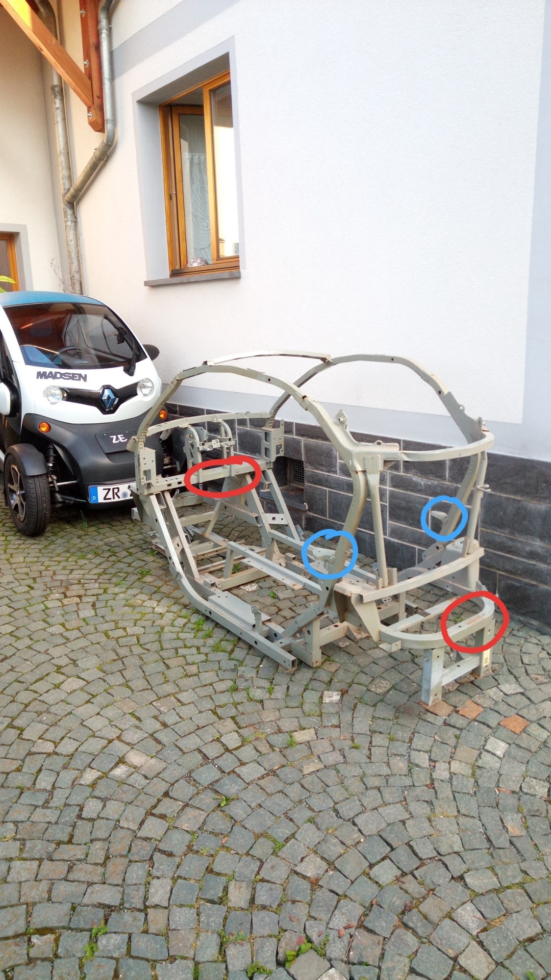 Wenn noch Papiere vorhanden, dann an den beiden rot markierten Stellen großzügig die Querrohre mit der Nummer (hinten) bzw. dem Aufkleber (vorne, ist etwa mittig von unten an das dicke Querrohr geklebt und lässt sich _NICHT_ ohne weiteres am Stück abziehen!) raussägen.