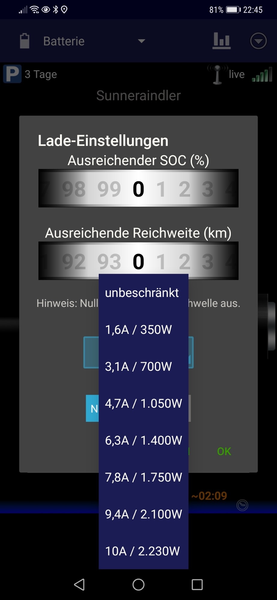 Ich habe hier gelesen das das Laden mit ca. 10A (~2200W) stattfindet. Kann man das irgendwie beinflussen? Also z.B. den Ladestrom auf z.B. 5A (~1100W) begrenzen ?