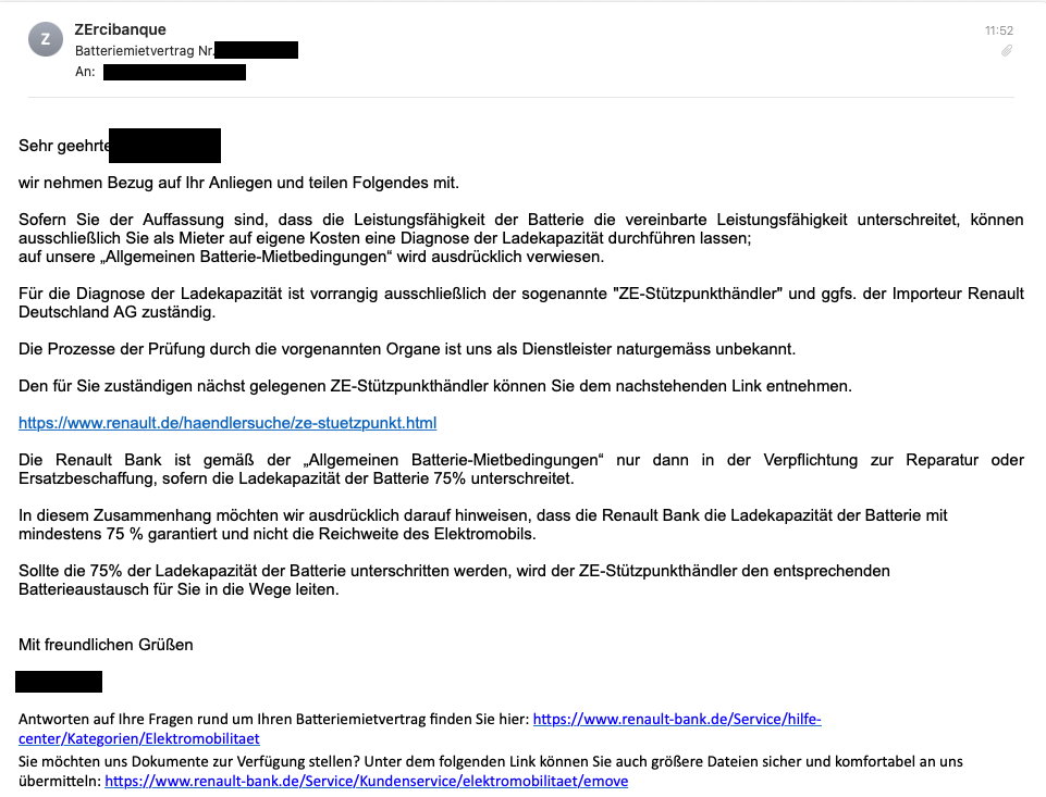 In diesem Zusammenhang möchten wir ausdrücklich darauf hinweisen, dass die Renault Bank die Ladekapazität der Batterie mit mindestens 75 % garantiert und nicht die Reichweite des Elektromobils.