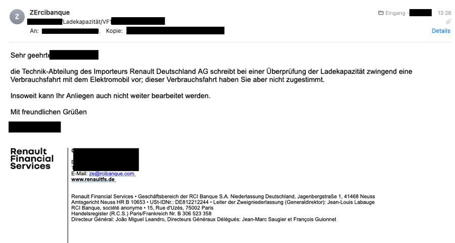 die Technik-Abteilung des Importeurs Renault Deutschland AG schreibt bei einer Überprüfung der Ladekapazität zwingend eine Verbrauchsfahrt mit dem Elektromobil vor;