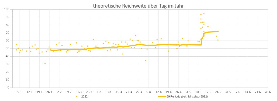 Hier ein Auszug meiner Reichweiten-Tabelle: