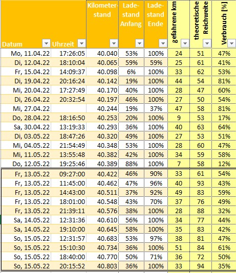 Die Daten bis zum 13.05 zeigen meine normalen theoretischen Reichweiten (lineare Hochrechnung der gefahrenen Strecke bei verbrauchten % auf 100%, Beispiel: 30km gefahren, 46% Rest => 30/(100-46)*100 = 56km theoretische Reichweite) .