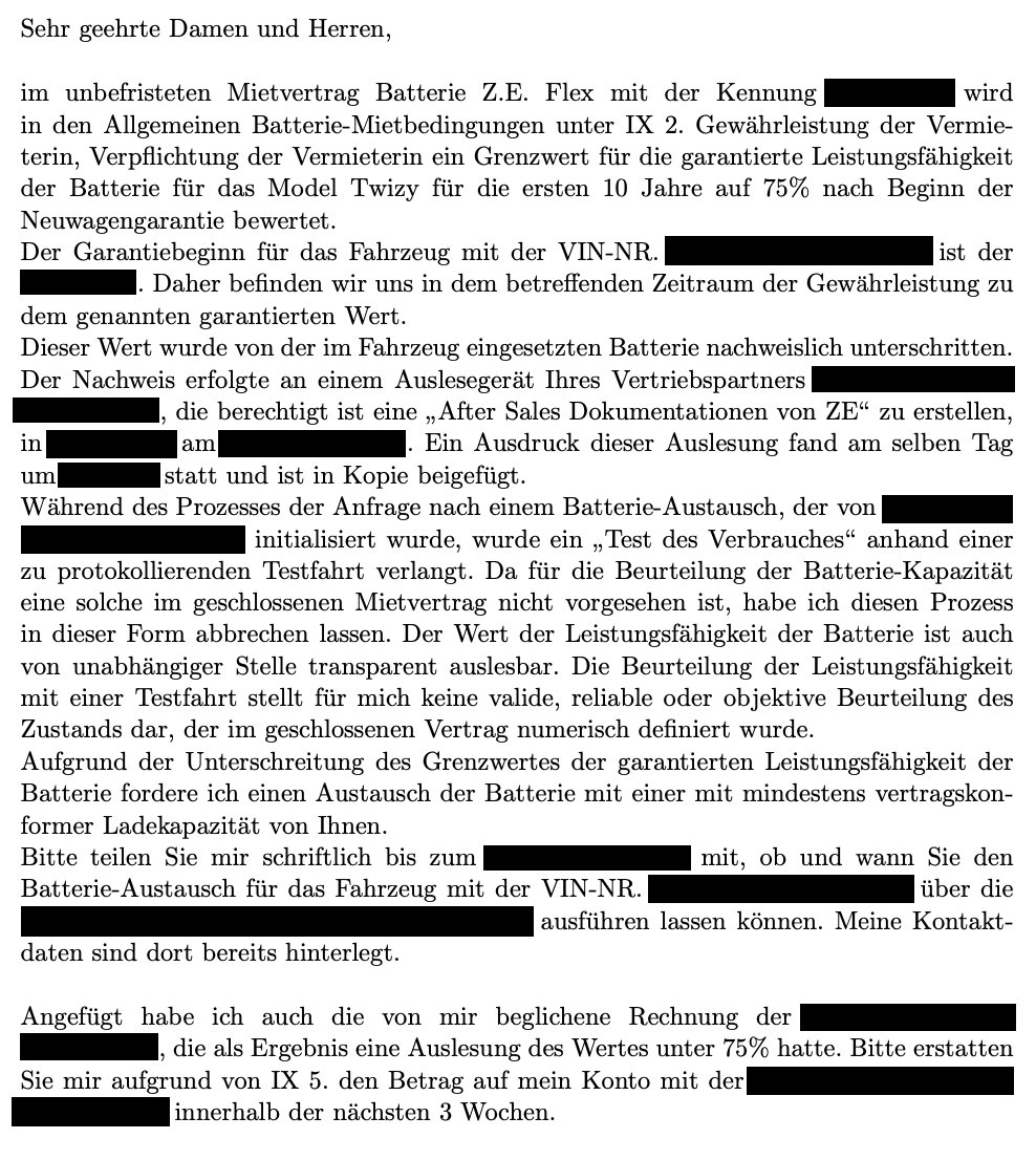 Ich kann deinen Zorn durchaus nachvollziehen, aber das mit der Einstellung der Zahlungen würde ich sein lassen. Wenn du Pech hast, legst du dir selbst ein Ei, da ja offiziell immer noch ein Vertrag besteht und du den Akku auch nutzt. Hast du von der Werkstatt einen schriftlichen Nachweis bekommen, dass der SOH unter 75% liegt oder "nur" die mündliche Aussage am Telefon?newbie schrieb: So - mal schauen, wie sehr die Renault-Banque lacht, wenn ich die Zahlungen aussetzen werde, in denen die Ihre vertragliche Verpflichtung nicht einhalten.