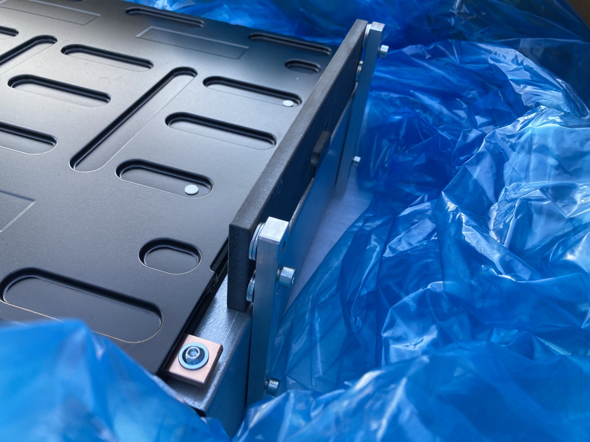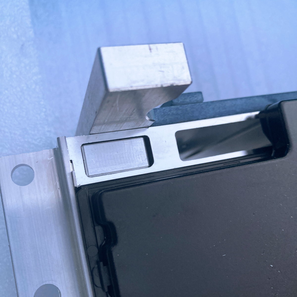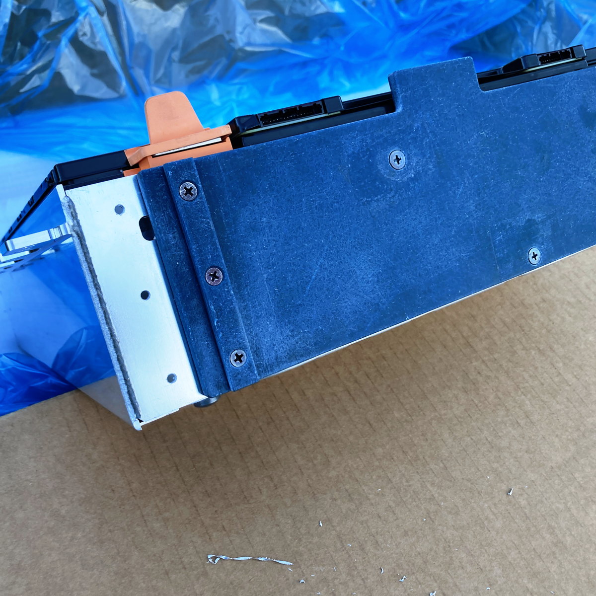 An der BMS-Seite dient die blaue Platte, die in zwei vorhandene Gewindelöcher am CATL geschraubt wird, die Löcher anzukörnen