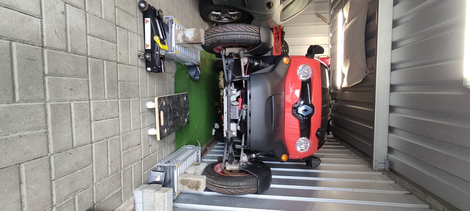 Die Spedition kam mit einem 7,5-Tonner mit Ladebühne - da konnte ich den Akku direkt auf meinen Hänger räumen lassen, denn hier kann ich nicht den Twizy vernüftig aufbocken - nur auf die Seite legen, aber den Aufschrei im Forum will ich nicht erleben müssen - dass da der Akku verkanten könnte, wenn das so gemacht würde.... für den Trabant gab es solche Gestelle .