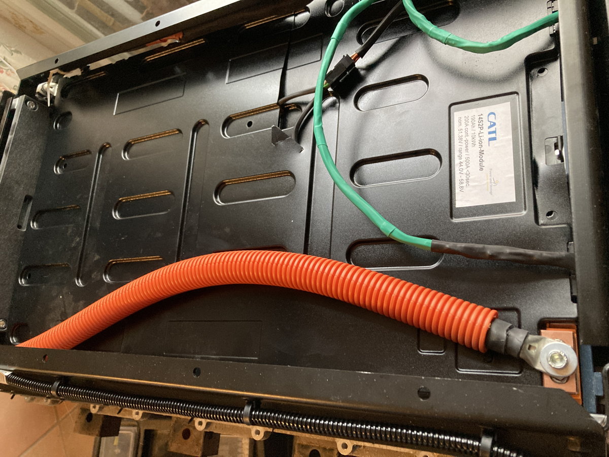 Die einzige Stelle, die ich nicht soo pralle fand, war die Stelle, an der der Kabelbaum vom BMS kommend an dem Minuspol und CATL-Alugehäuse vorbei muss. Da könnte glatt noch was vom CATL abgesägt werden - da treffen scharfe Kanten auf Kabel - ich hab da jetzt Kabelbinder genutzt um möglichst wenig Bewegung da zuzulassen.