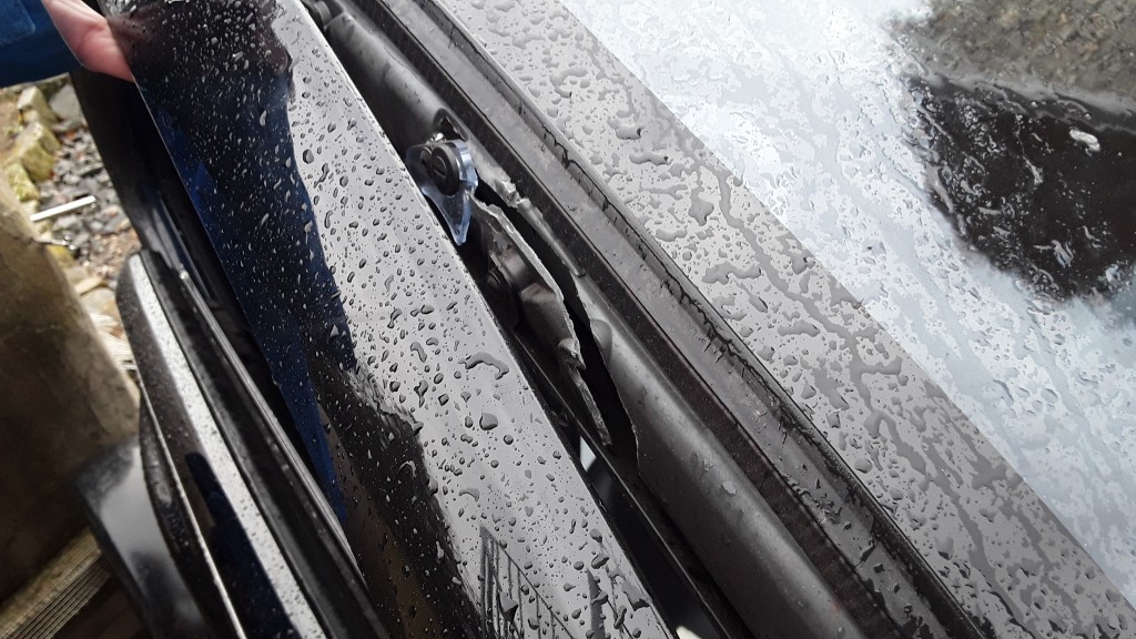 Die Böen haben ihn wohl vor und zurück gerollt, und als der Keil weggedopst war hats ihn rückwärts die Abfahrt runtergerödelt.. erst ist er am Kamin hängen geblieben, dann noch an der Fensterbank, um dann glücklicherweise mit dem rechten Hinterrad an der Ofengrundplatte zu stranden.. mal sehen was noch alles krumm ist.. Spiegel, Dreiecksscheibe, Rahmenverkleidung, C-Verkleidung sind hin, hinten hat er in verlängerung der Türkante nen fetten Kratzer..