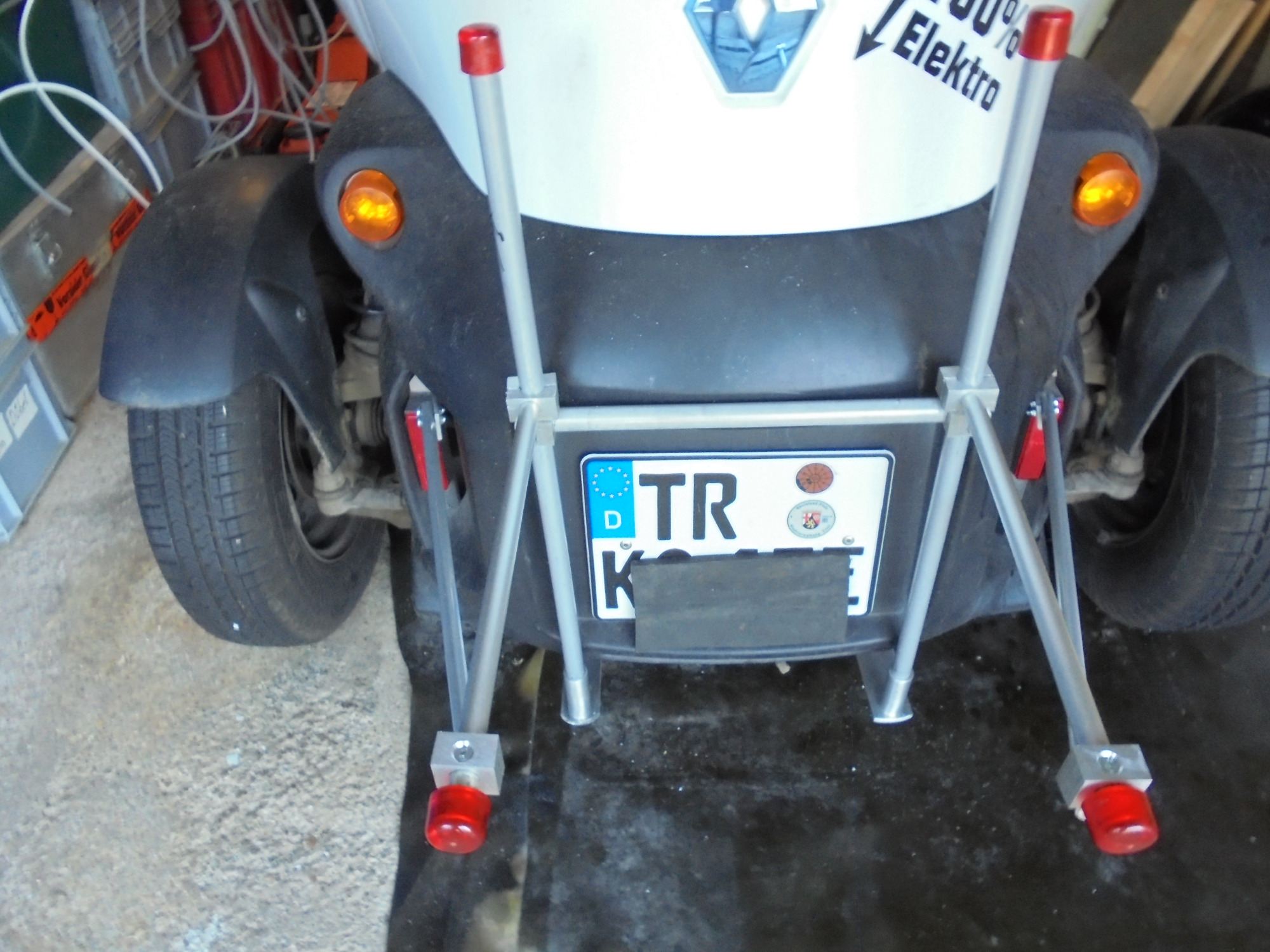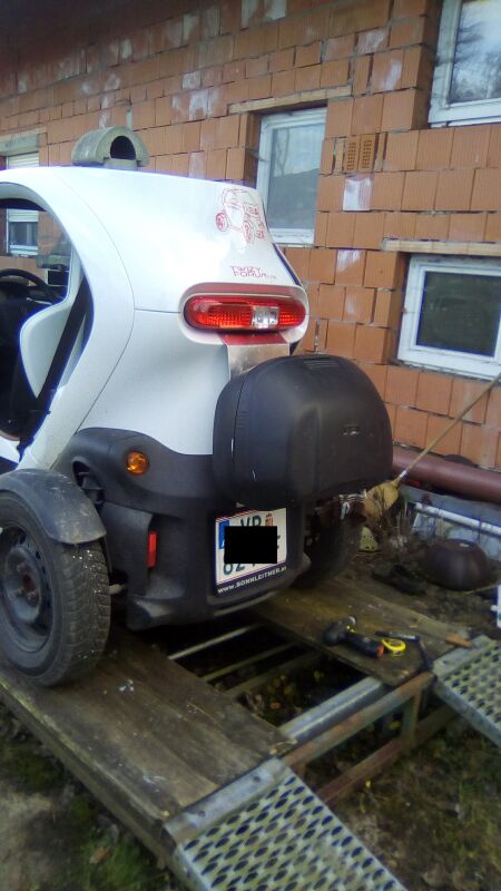 Übrigens eine kurze flache Aluleiter unter den Twizy verspannen und die letzten drei Sprossen heraus stehen lassen geht auch, 90° nach oben biegen wäre auch kurzzeitig brauchbar