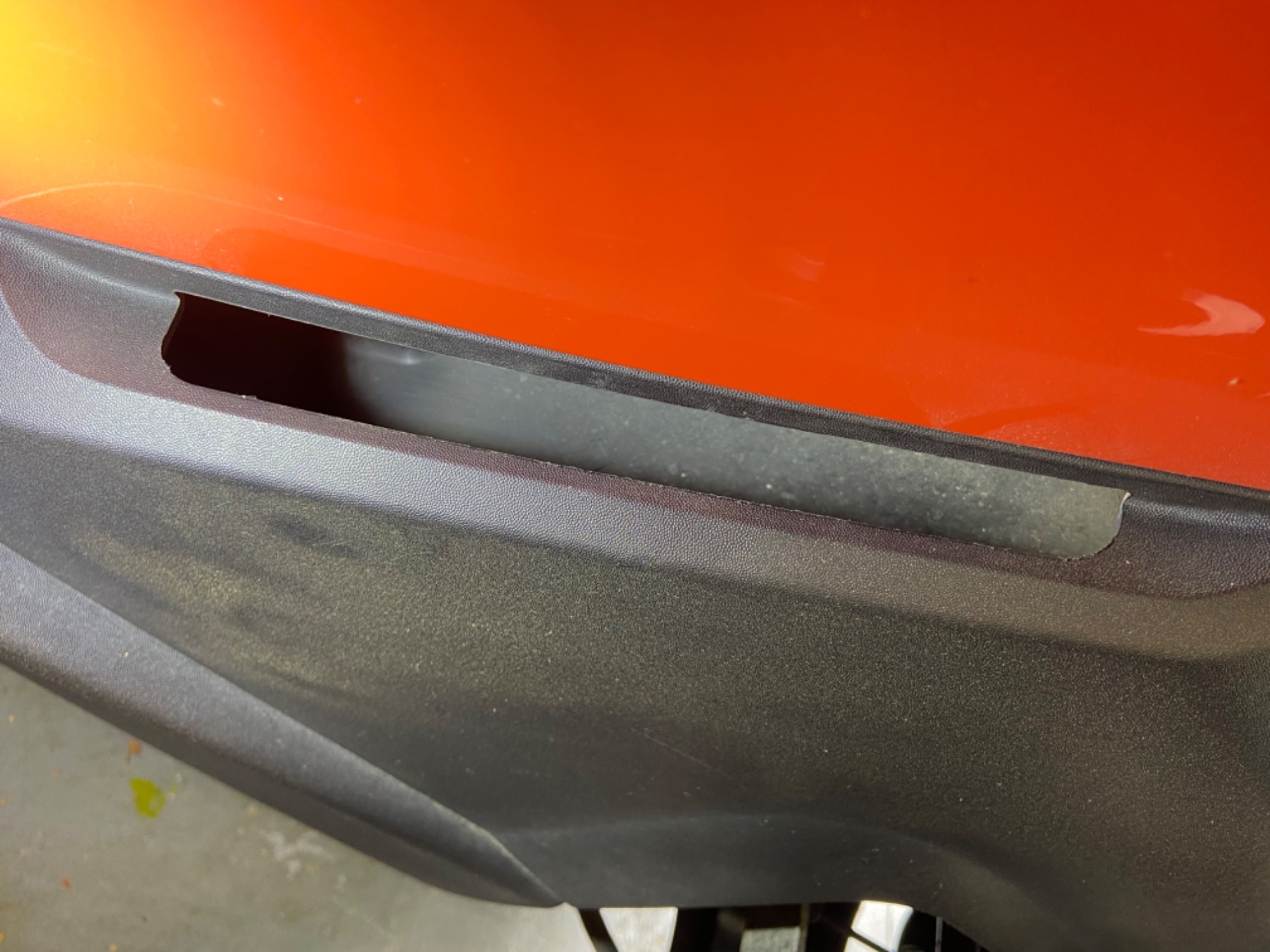 die Ränder noch etwas bearbeiten. Eine Hebebühne wäre schön für diese Arbeit. Der neue Luftschlitz zum Motorraum soll mindestens so groß werden wie der alte Lufteinlass an der Seite. Diese Bearbeitung ist aber nur vom Motorraum aus machbar.