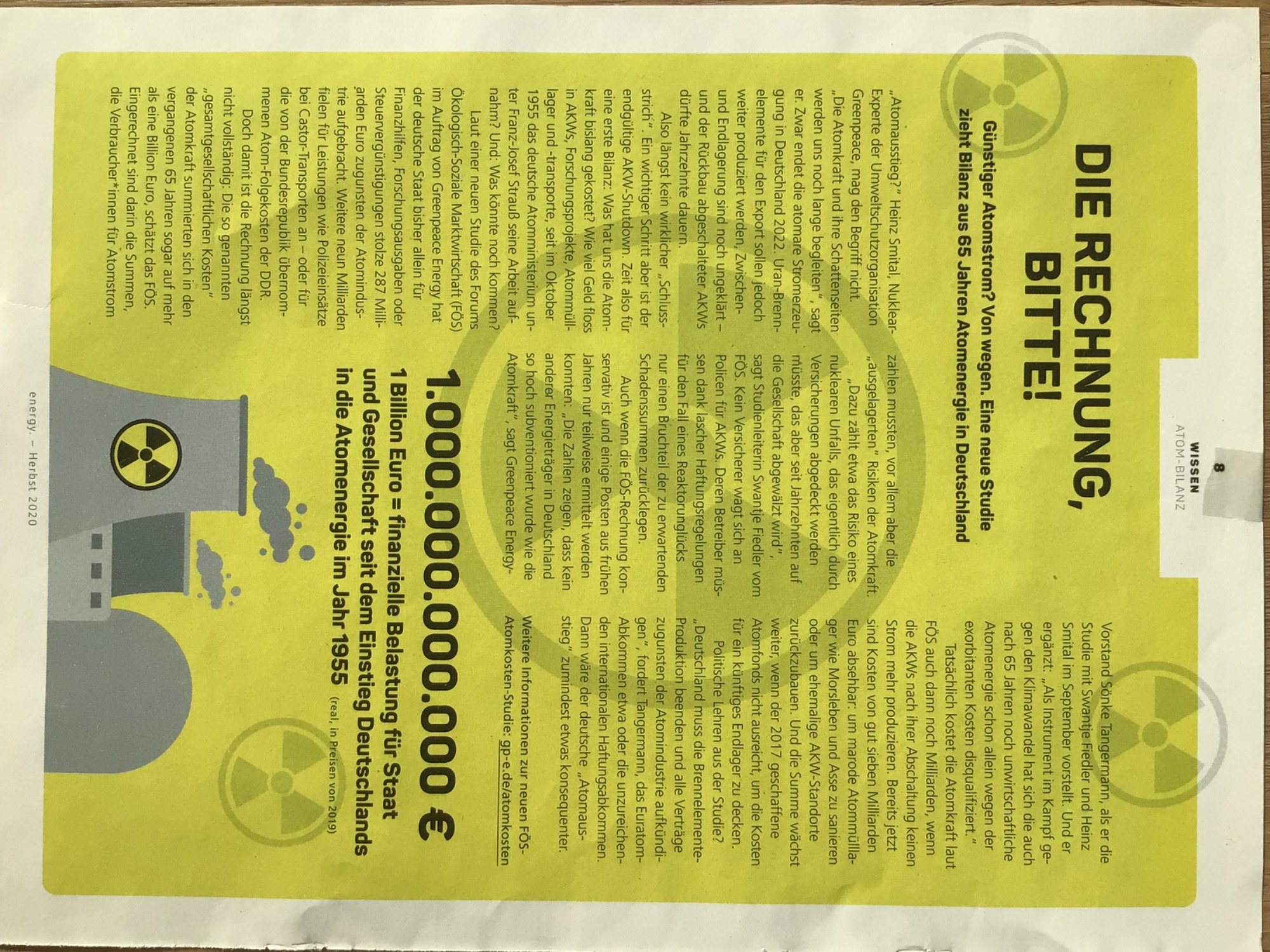 Denjenigen, die über die „unglaublich hohe Förderung“ der PV-Anlagen schimpfen, stelle ich immer die Frage, wie hoch die Summe ist, mit der wir Steuerzahler den Atomstrom subventionieren. Standard-Antwort ist meistens: „Häh? Gar nicht!“ richtige Antwort Stand 2020 ist aber:
