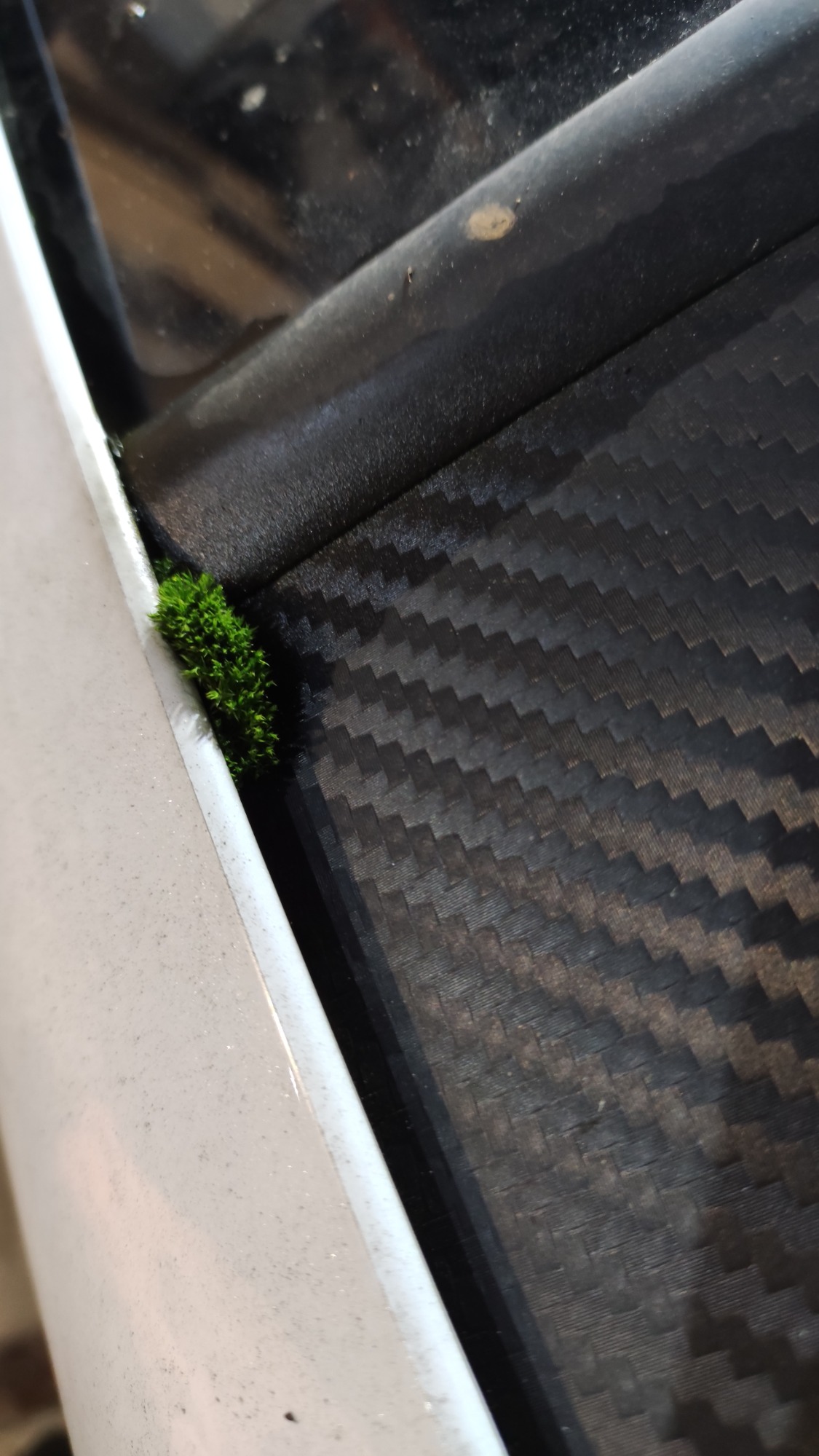 Mir ist leider zu spät eingefallen, die Flora und Fauna hinter der Frontschnauze in der Rinne am unteren Ende der Scheibe filmisch und fotografisch festzuhalten.