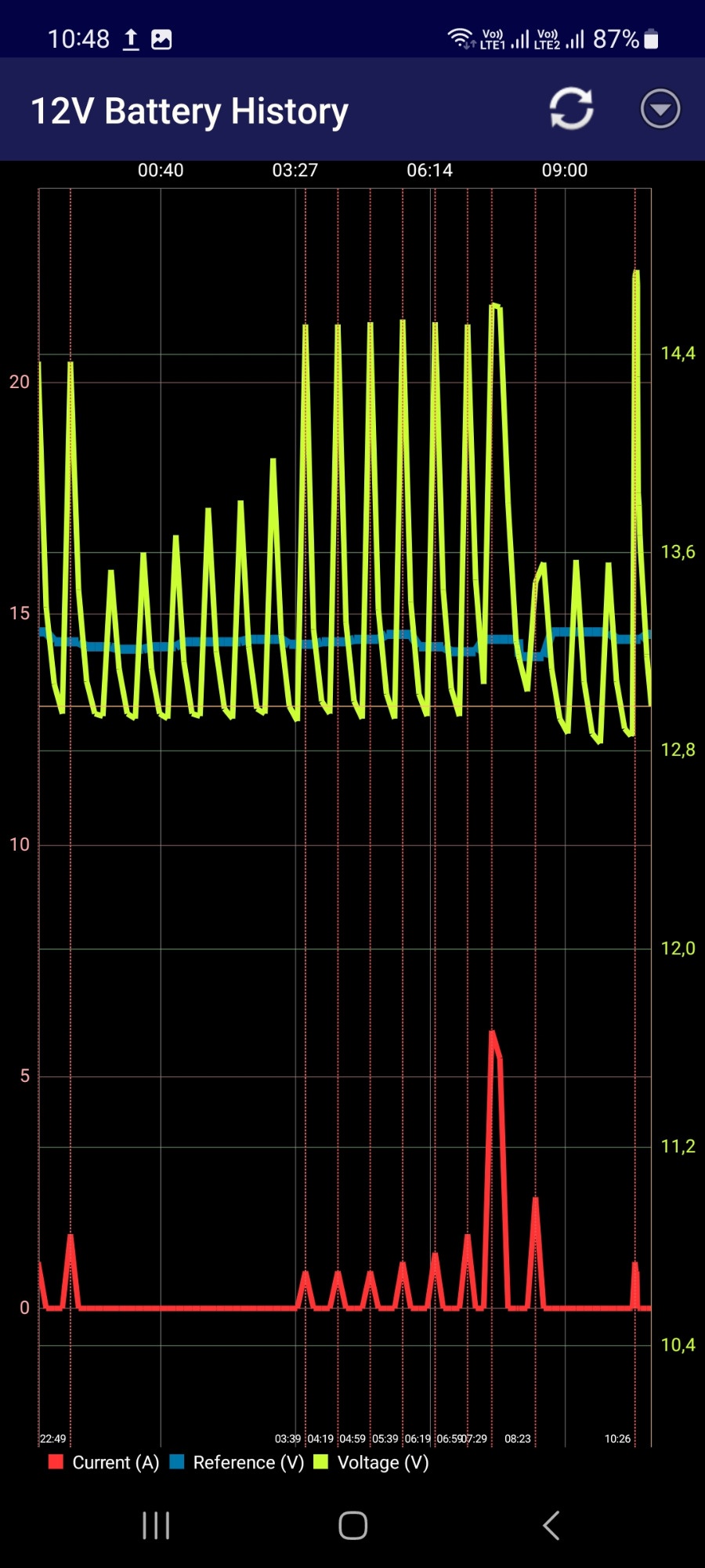 Über die ersten 3 Monate habe ich die Batterie auf 100% geladen, später bis 90% und zuletzt bis 80%. Gestern Abend habe ich sie bis 95% geladen, dabei sich dabei eine Reichweite von 62km aufgebaut. Im Diagramm des Ladezustands (SoC) konnte ich aber einen Rückgang der Werte gleich nach dem Laden, sowie in der Nacht, beobachten, so dass der Ladezustand am frühen Morgen bei 83% lag. Die Batterie 12 V wurde vor 3 Wochen durch eine neue ersetzt. Sieht das Ladediagramm dieser Batterie in Ordnung aus?