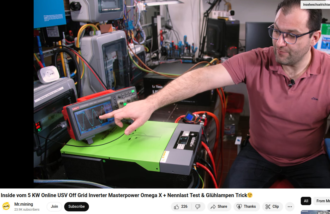Die Masterpower Klones zieht 80 Watt im Leerlauf und hat keine gute Standby Funktion welches angesteuert werden kann. Das ist nicht gut.Instabridge schrieb: PS: Denke die Voltronic = MPPSolar = Masterpower sind schon okay so lange man 1. keine grossen Erwartungen an die Langlebigkeit des Geräts hat 2. nicht mehr als 1000W ziehen möchte und die an einen AC-IN anschliesst (d.h. 24-7 durchlaufen, dabei 50W verbrauchen, weil jeden Tag on-off-on-off verschleissen die Dinger vermutlich recht flott (X < 3 Jahre?))