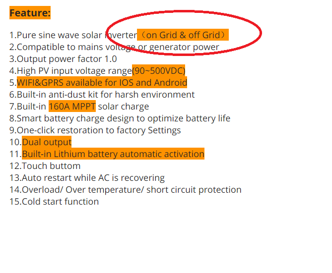 Die Beschreibung von China-Invertern ist leider sehr sehr schlecht: AC ON & OFFGRID heisst (vermutlich) nur dass der WR (WechselRichter) einen AC IN hat, d.h. wenn Akku leer und kein Sonnenstrom, dann nimmt der WR den Strom via Schuko aus'm Netz und lädt damit wahlweise die Batterie wieder auf (ob diese Umschaltung ohne Downtime abläuft .... hm...?)