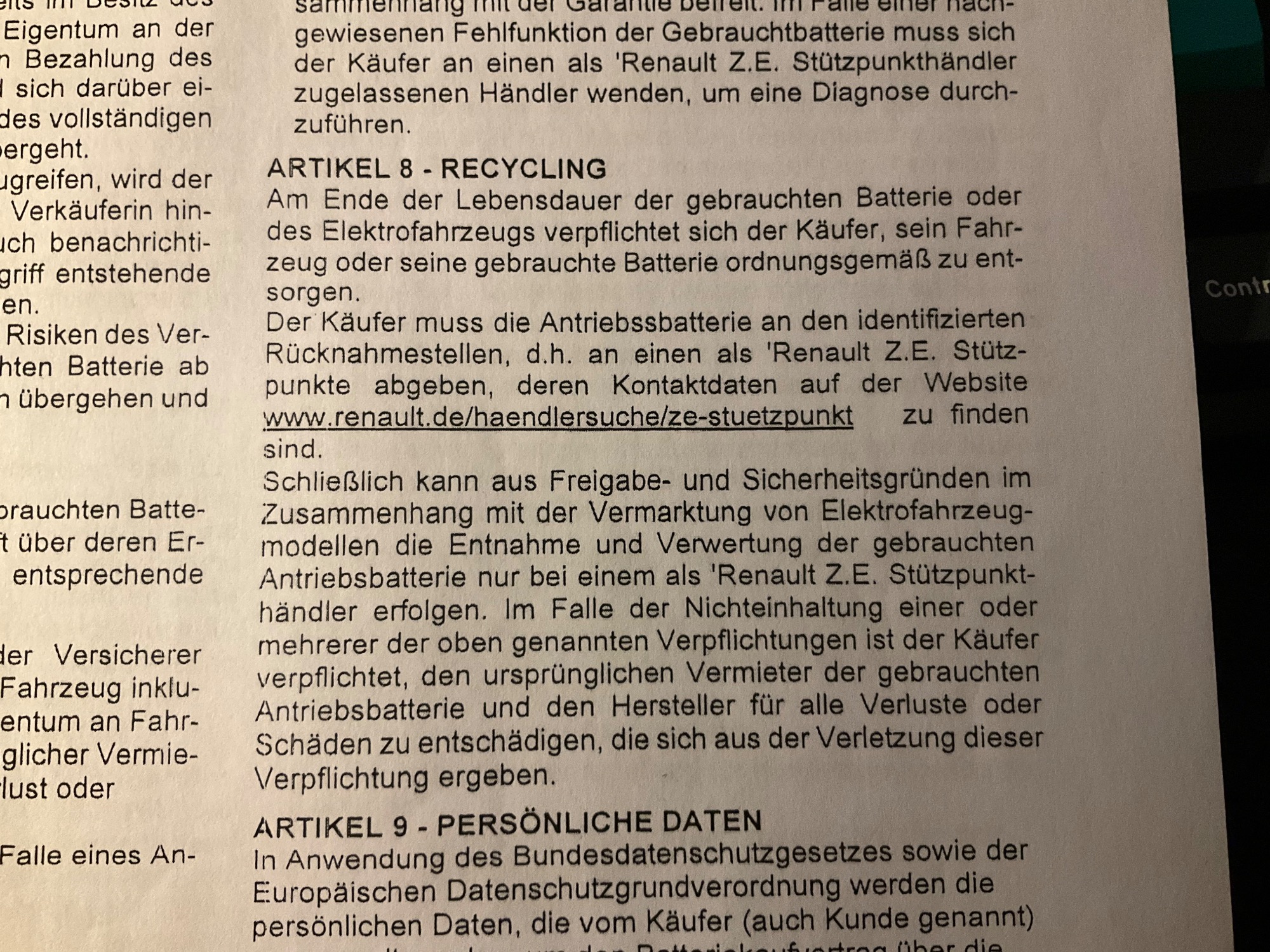 mir liegt gerade der Kaufvertrag für die Twizy-Batterie von Mobilize vor. Irgendwie tue ich mich schwer mit Artikel 8 Recycling - vielleicht auch nur vom Verständnis.