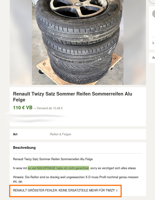 Why are front tires hard to find? I recently bought original continental winter and summer ones in Poland, it is also worth noting that the mobilize duo, according to the photo, highlights the same size of wheels and tires front and rear as in twizyJPB schrieb: Naja, der Anbieter lässt in der Anzeige seinen Druck ab, da er vermutlich vergebens auf Ersatzteile wartet. Wie wir alle wissen, sind nicht alle Teile einfach und direkt zu beschaffen (siehe Bremsen, Lenkung und jetzt teilweise auch vordere Reifen).