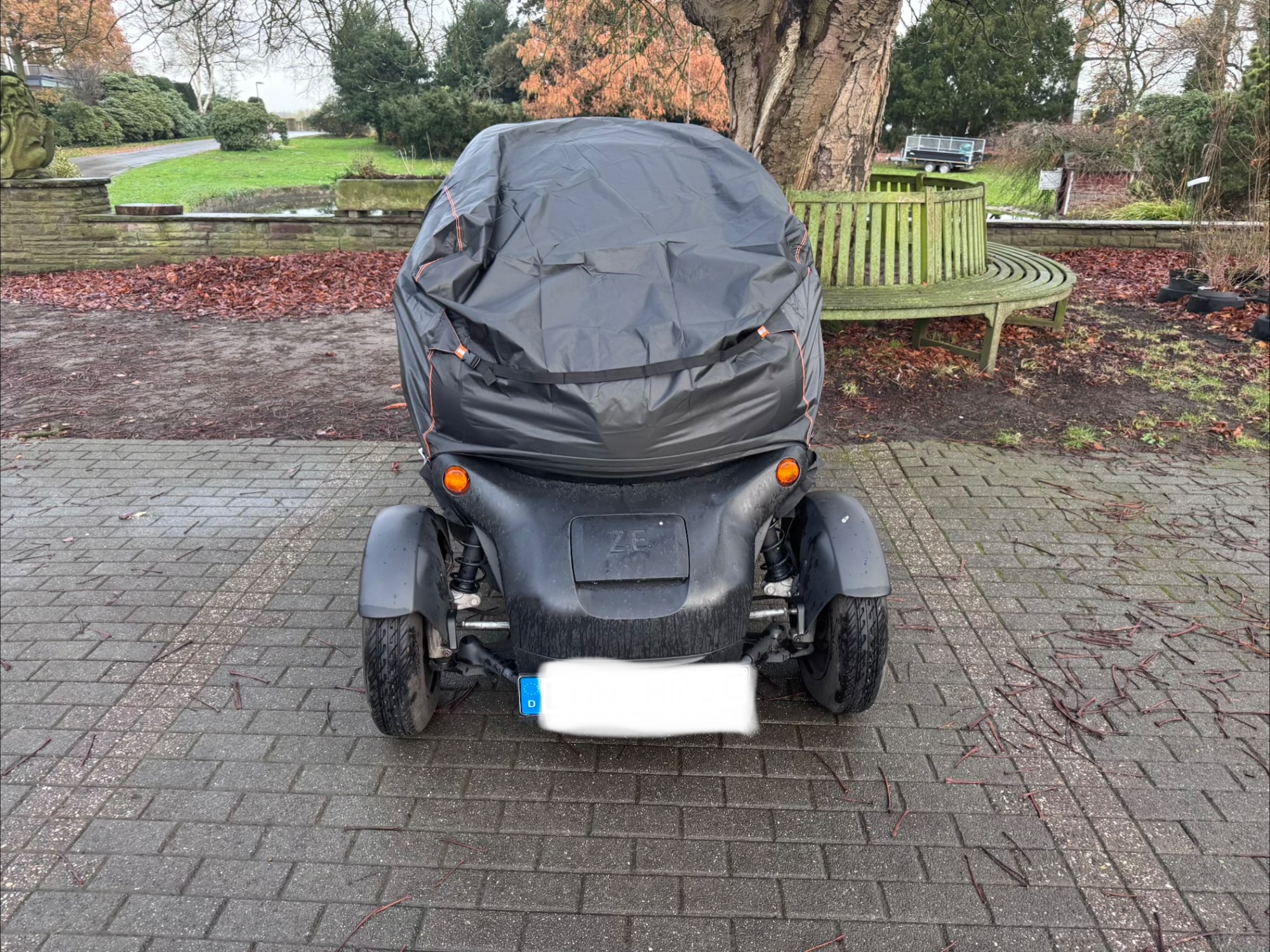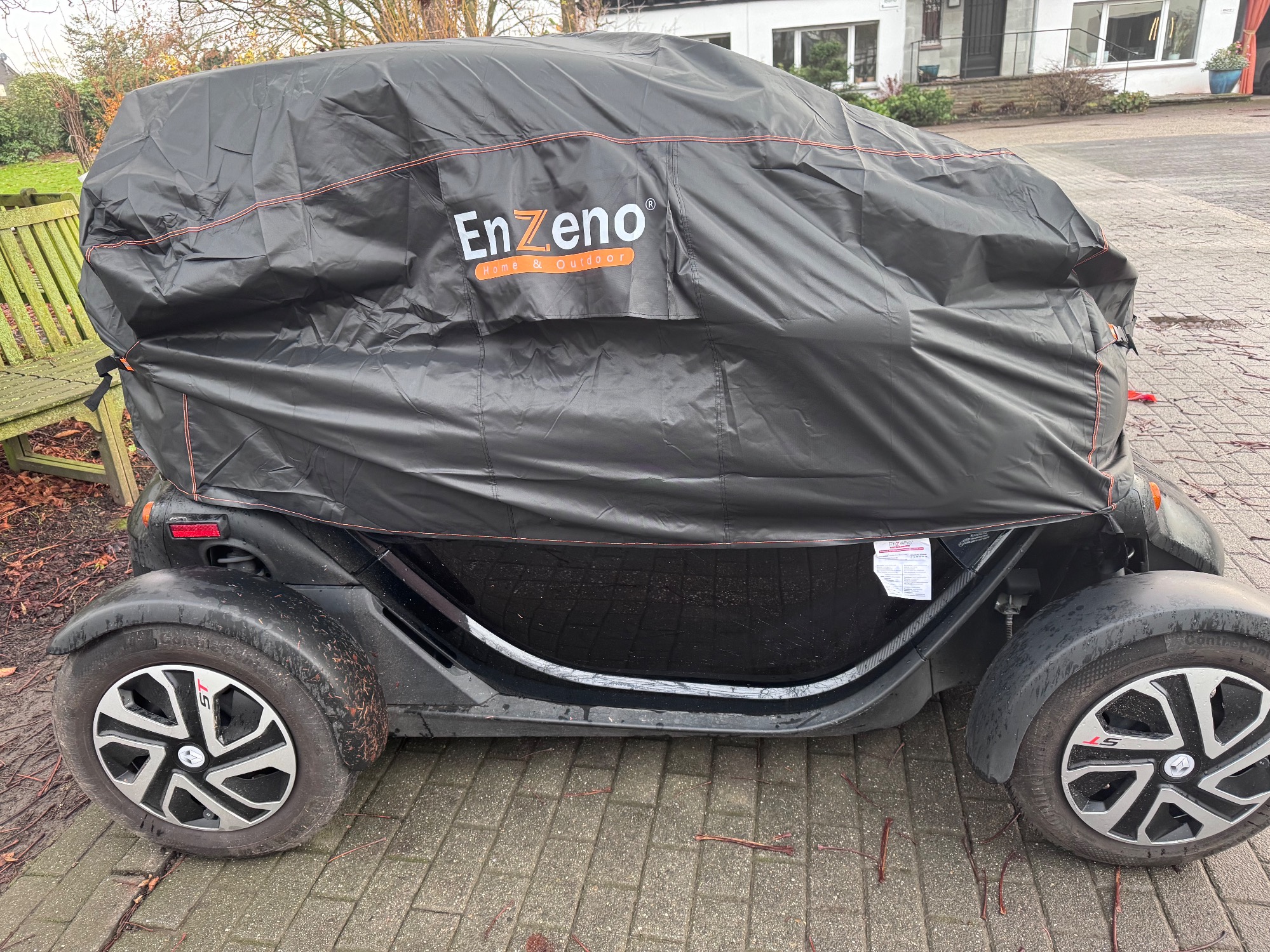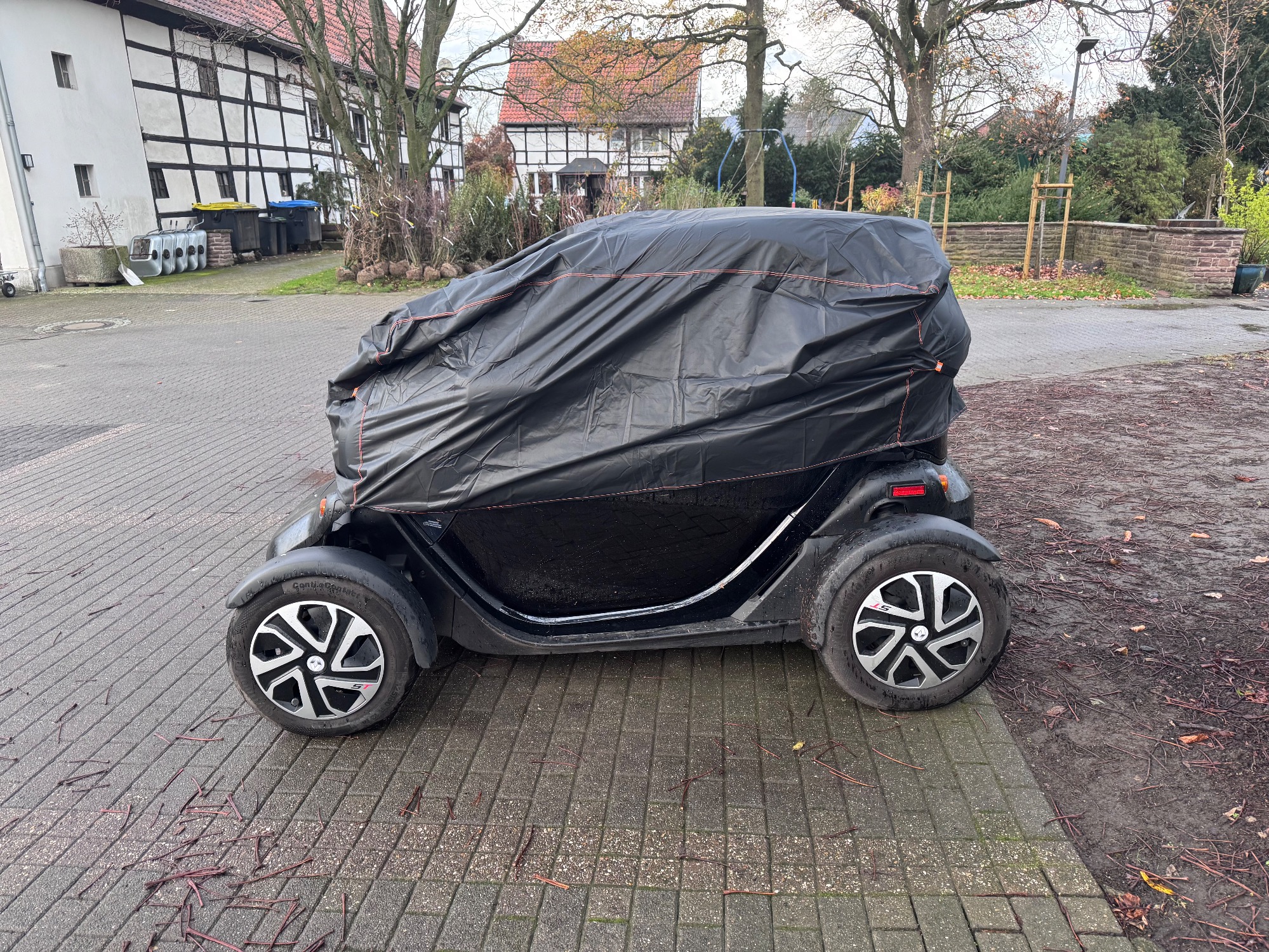 Vorne an den Federn mit den Klettband (sind angenäht) und hinten in der Talie vom Heck des Twizy mit Spannband welsches auch angebracht sind.