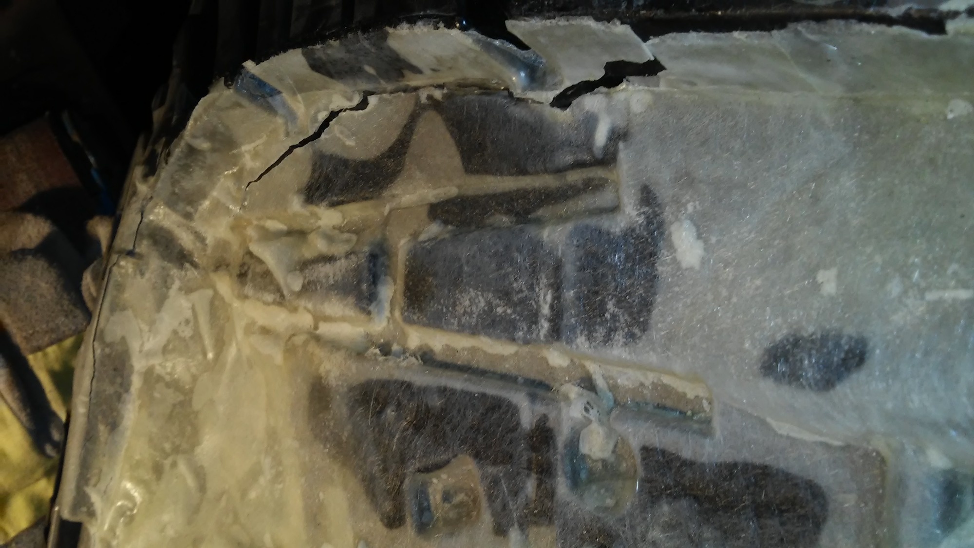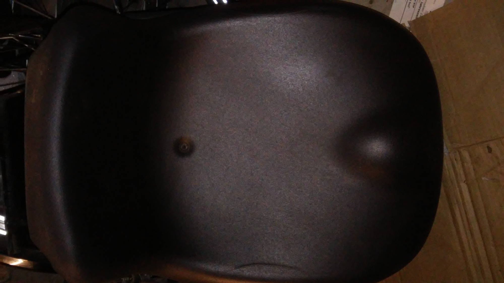 Darunter kam die von trockenem Leim bedeckte Stützschale zum Vorschein, die zwar nicht in der Mitte, jedoch am Rand gerissen ist. Rührt vielleicht von der Vorbesitzerin her, die ich nur auf 50 kg Eigengewicht einschätze. Die Polsterschale ist an beiden Seitenrändern leicht eingerissen - wohl weil ich mich mit Doppelzentnergewicht ein paarmal reingesetzt habe.