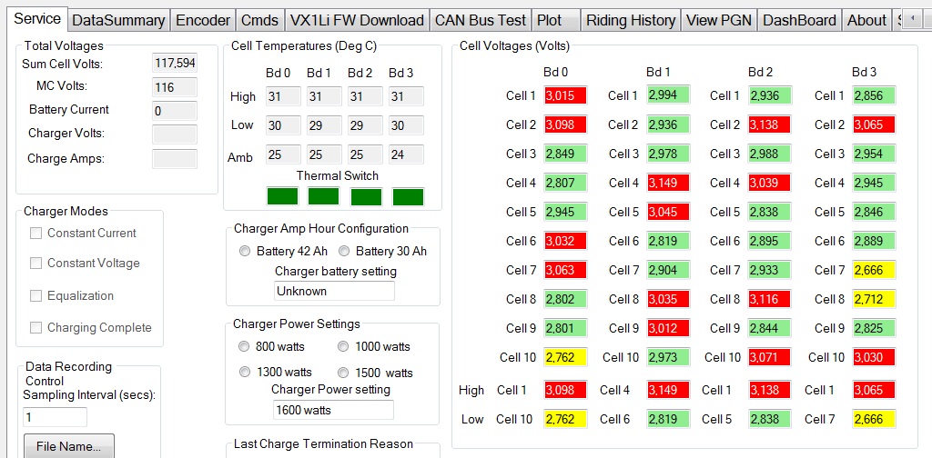 Damit meine ich: Laptop ins Helmfach, Kabel eben "fliegend" vom Helmfach nach vorn ins Handschuhfach. Die Software kann die Werte aufzeichnen und man schaut sie sich danach an oder man macht (wie ich) einfach automatisiert alle 10 Sekunden einen Screenshot und schaut sich das danach an. So fahre ich natürlich nicht ständig, sondern nur alle paar Monate mal um bei niedrigem Akkustand die Zellen zu beobachten.