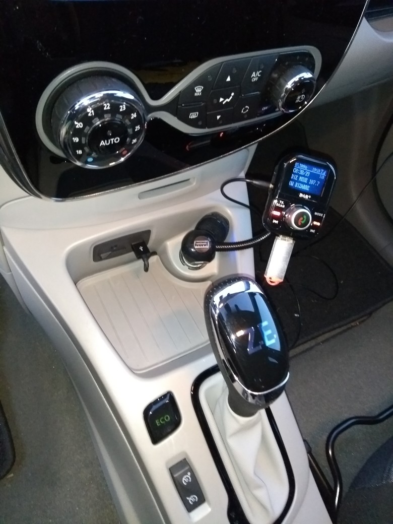 Noch mal vorne, rechts der DEPP+ Empfänger, über UKW ins Radio (über Klinke auch möglich) mit USB STick, der zuvor am Zoe-USB eingesteckt war.