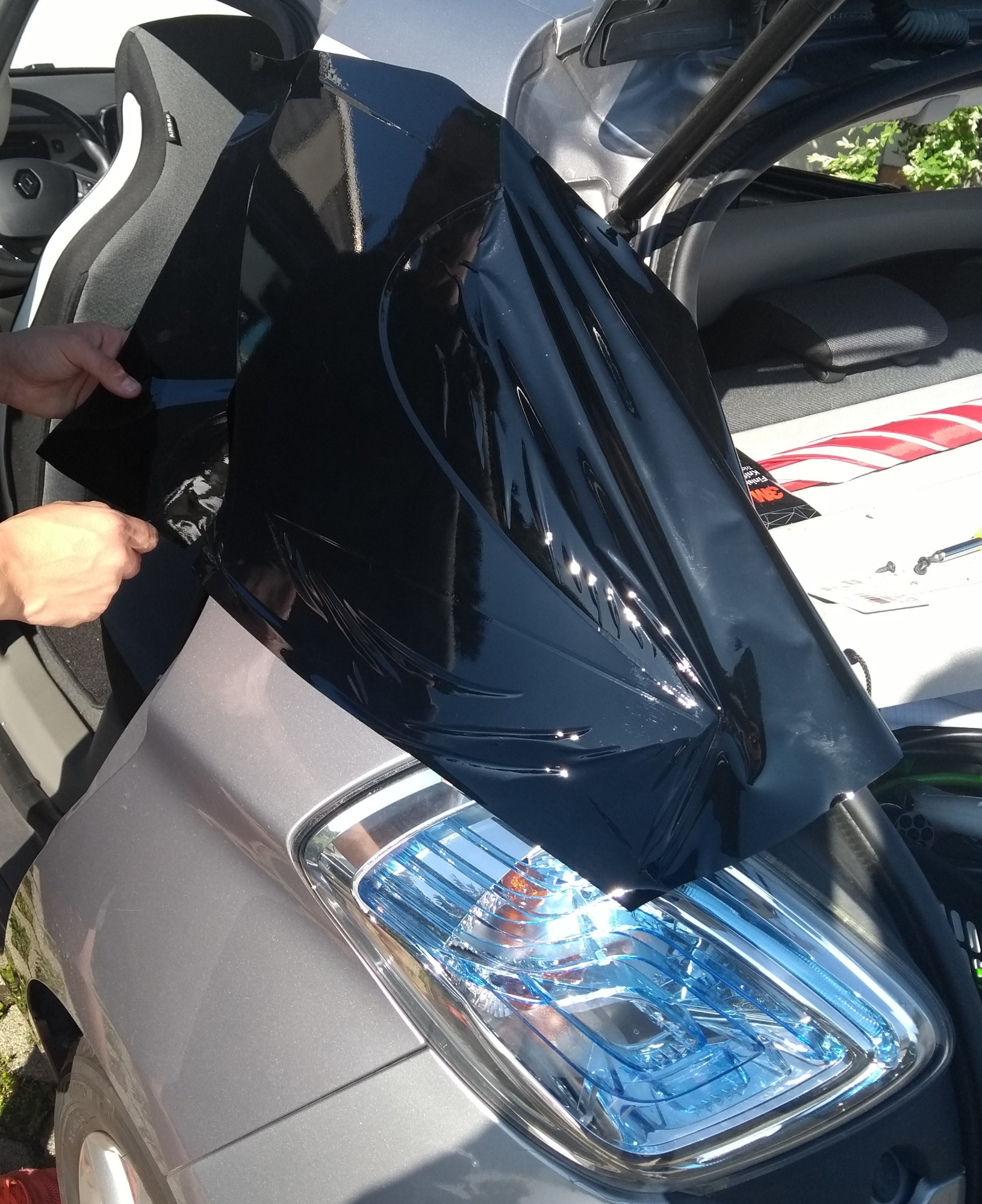 Aber wenigst bekommt man durch die abgebauten Türgriffe die Folie nun schön aufgeklebt. Hinten um besagte schwarze Verkleidung muss man dann mit Überstand schneiden und mit einer Bankkarte und einer etwas 1/3 so dicken Karte oder Werkzeug (ich hatte noch einen eingeschweißten Ausweis zur Hand, das geht dann gut) unter diese Verkleidung schieben.