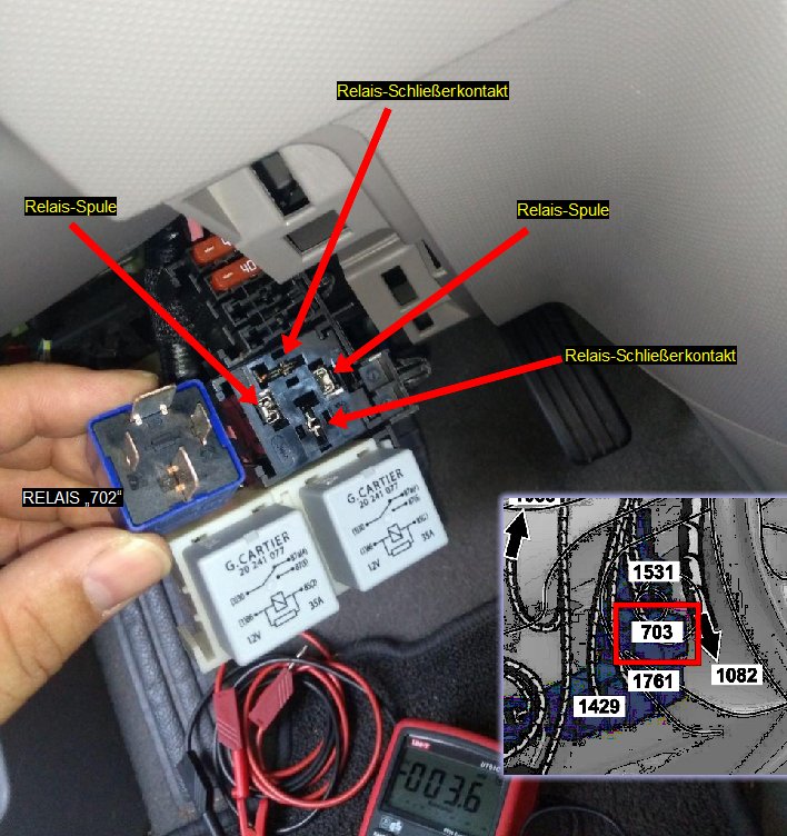 Ich habe dann mit einem Krokokäbelchen von hinten den Relais-Kontakt angezapft und unter die Schraube (s. Bild) gelegt.